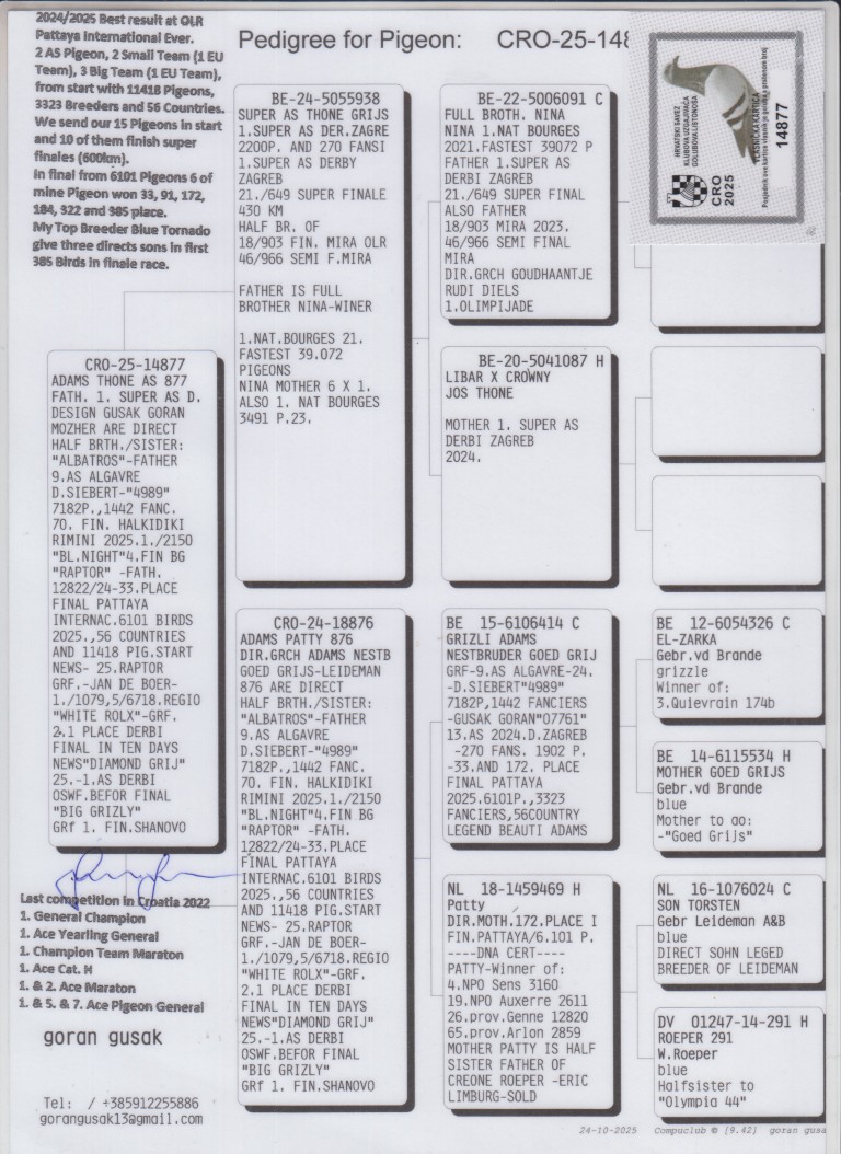 Uit: ”Super As Thoné Grijs”, 1. Super Asduif OLR Derby Zagreb x ”Adams Patty 876”, dochter ”Grizli Adams”, nazaten winnen 1. & 2. OLR Finale As Croatia, 1. OLR Finale Derby Belgrade, 1. OLR Hotspot Fast Rimini