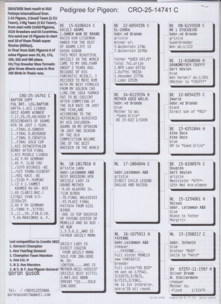 Uit: ”Grizli Adams”, nazaten winnen 1. & 2. OLR Finale As Croatia, 1. OLR Finale Derby Belgrade, 1. OLR Hotspot Fast Rimini, 9. Asduif OLR Golden Algarve, nestbroer ”Goed Grijs” x ”Grizzle Lady”, Gebr. A. & B. Leideman