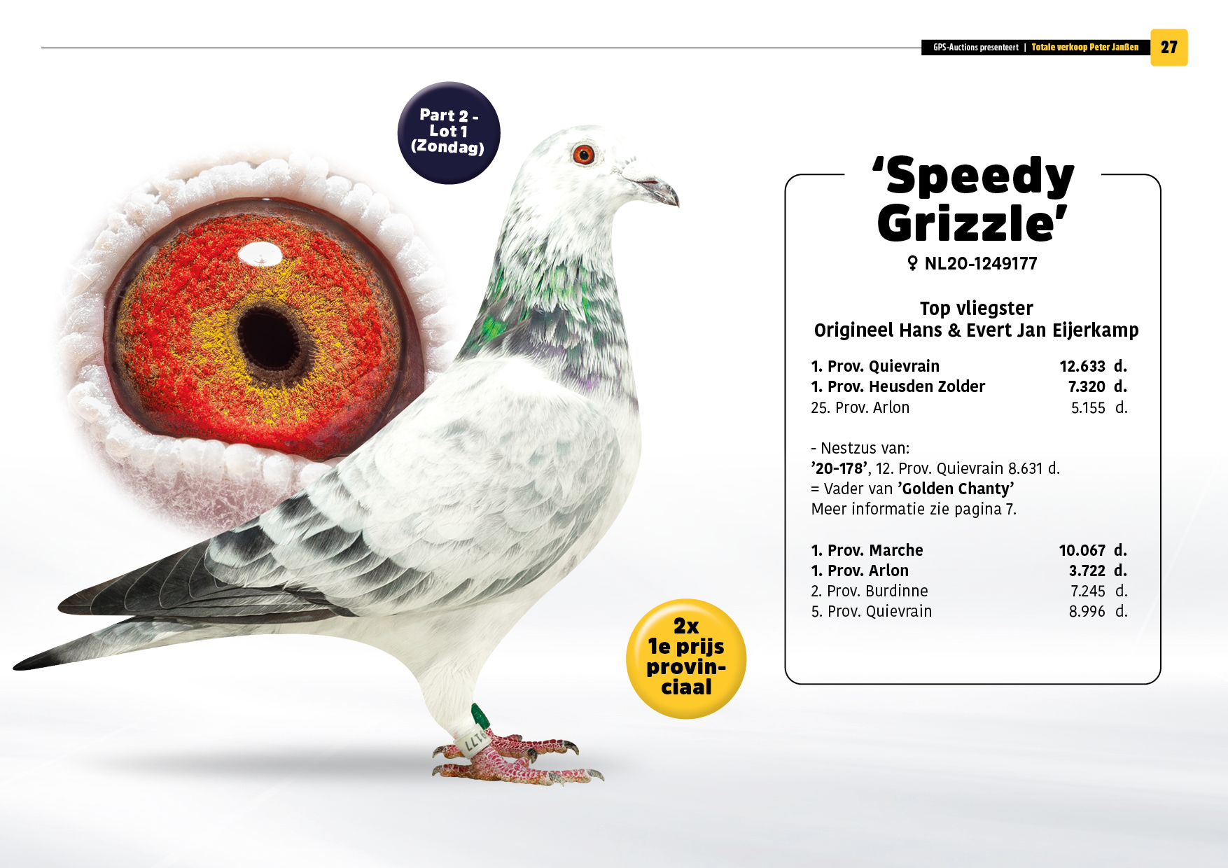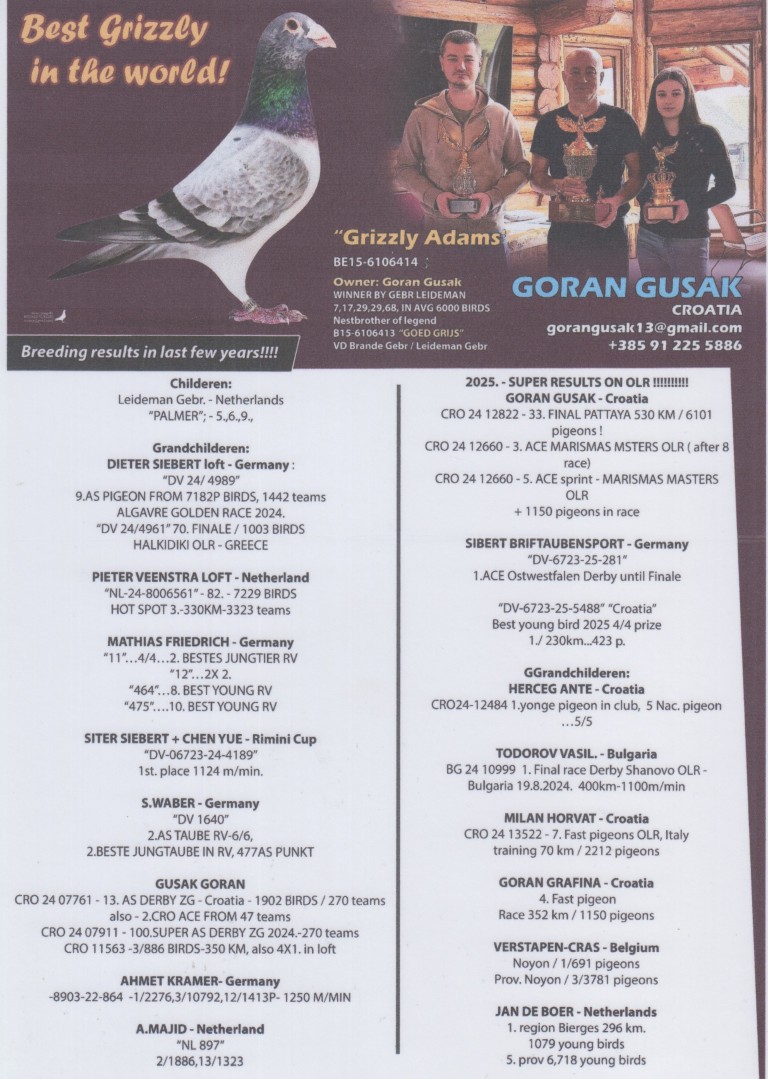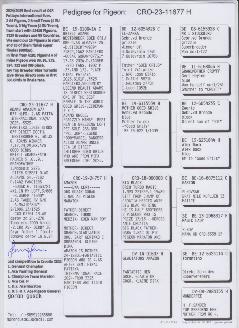 Uit: ”Grizli Adams”, nazaten winnen 1. & 2. OLR Finale As Croatia, 1. OLR Finale Derby Belgrade, 1. OLR Hotspot Fast Rimini, nestbroer ”Goed Grijs” x ”Amazon”, 1. Nat. Asduif Marathon & moeder 2. Asduif OLR PIPR Pattaya