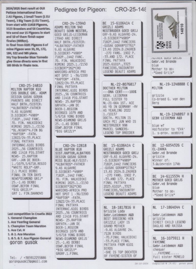 Uit: ”Adams Milton 940”, zoon ”Grizli Adams” x ”Blue Raptor 818”, dochter ”Grizli Adams”, nazaten winnen 1. & 2. OLR Finale As Croatia, 1. OLR Finale Derby Belgrade, 1. OLR Hotspot Fast Rimini, 9. Asduif OLR Golden Algarve