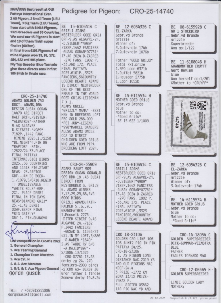 Uit: ”Grizli Adams”, nazaten winnen 1. & 2. OLR Finale As Croatia, 1. OLR Finale Derby Belgrade, 1. OLR Hotspot Fast Rimini, nestbroer ”Goed Grijs” x ”Adams Raket 909”, dochter ”Grizli Adams”, Unieke OLR kweker
