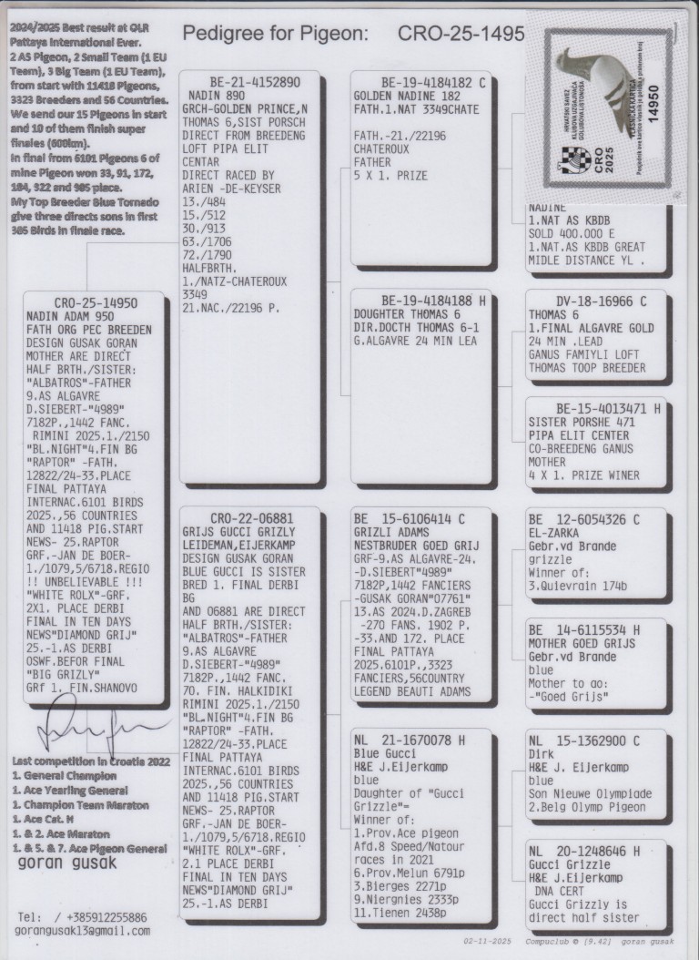 Uit: ”Nadin 890”, uit zoon ”Golden Prince”, 1. Nat. Asduif KBDB Fond, uit zoon ”Nadine”, 1. Nat. Asduif KBDB GHF x ”Grijs Gucci Grizly”, dochter ”Grizli Adams”, nestbroer ”Goed Grijs”, 7x 1. Prijs”, Gebr. Leideman
