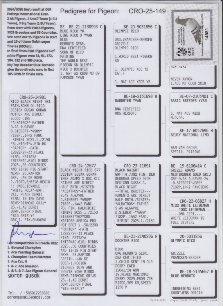 Uit: ”Blue Rico Yr.”, zoon ”Olympic Rico”, 1. Int. Olympiade Cat. Jonge Duiven, 1. Int. Asduif FCI World Best Pigeon x ”Black Night Rico”, uit zoon ”Grizli Adams”, nestbroer ”Goed Grijs”, uit dochter ”Olympic Rico”
