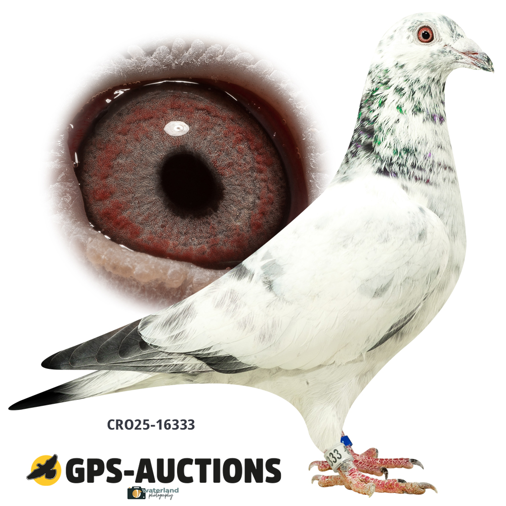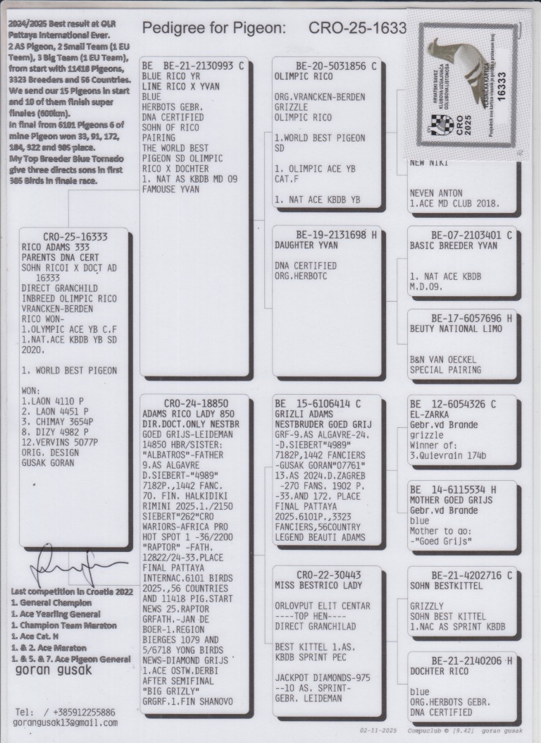 Uit: ”Blue Rico Yr.”, zoon ”Olympic Rico”, 1. Int. Olympiade Cat. Jonge Duiven, 1. Int. Asduif FCI World Best Pigeon x ”Adams Rico Lady”, dochter ”Grizli Adams”, nestbroer ”Goed Grijs”, uit kld. ”Olympic Rico”