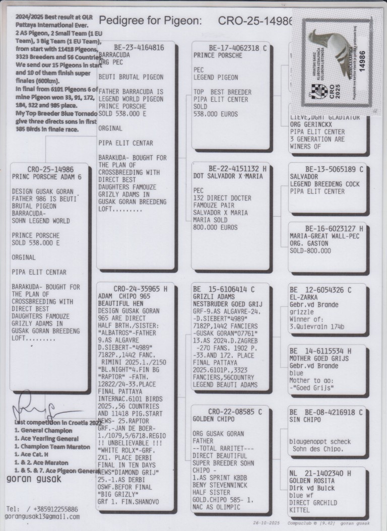 Uit: ”Barracuda”, zoon ”Prince Porsche”, OLR Wonderkweker x ”Adam Chipo 965”, dochter ”Grizli Adams”, nazaten winnen 1. & 2. OLR Finale As Croatia, 1. OLR Finale Derby Belgrade, 1. OLR Hotspot Fast Rimini