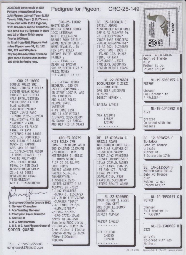 Uit: ”White Rolex”, zoon ”Grizli Adams” x ”Miss Rolex 779”, dochter ”Grizli Adams”, nazaten winnen 1. & 2. OLR Finale As Croatia, 1. OLR Finale Derby Belgrade, 1. OLR Hotspot Fast Rimini, 9. Asduif OLR Golden Algarve