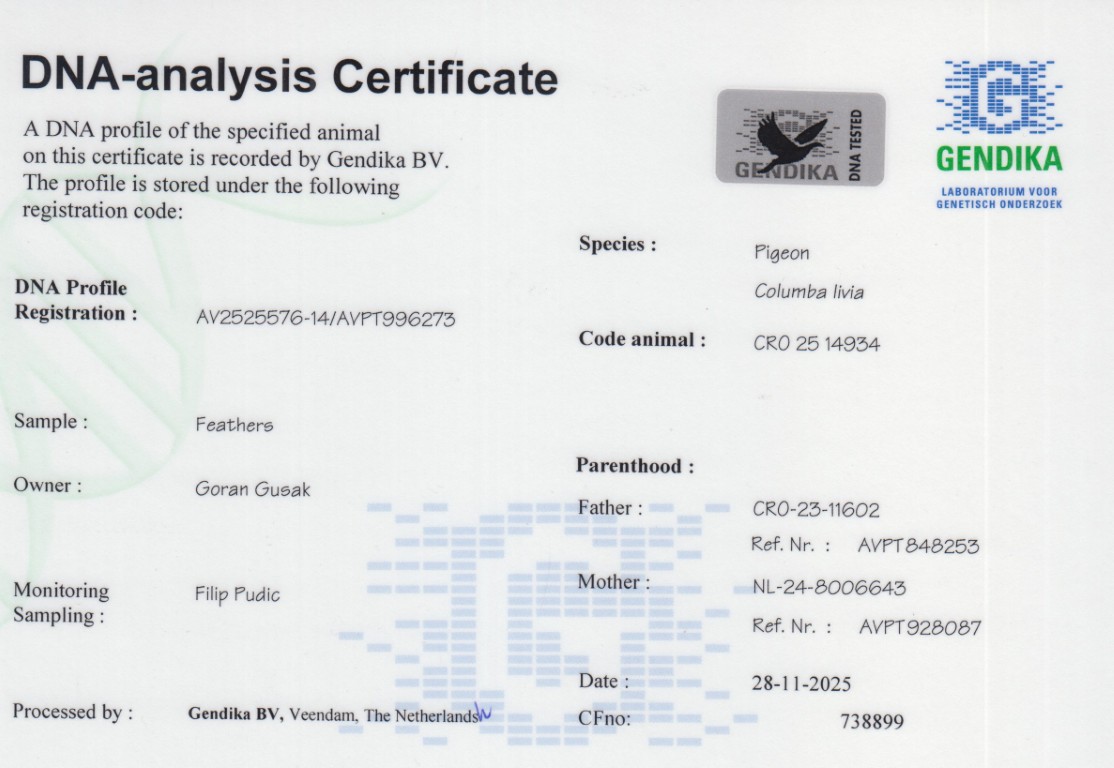 Moeder: NL24-8006643. ‘Golden Corina 643’, Veenstra Pigeons.