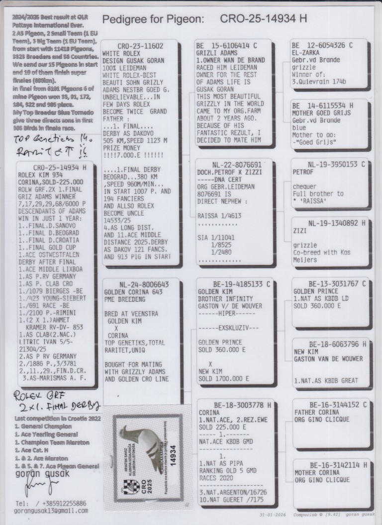 Uit: ”White Rolex”, zoon ”Grizli Adams”, nazaten winnen 1. & 2. OLR Finale As Croatia, 1. OLR Finale Derby Belgrade, 1. OLR Hotspot Fast Rimini, 9. Asduif OLR Golden Algarve x ”Golden Carina 643”, dochter ”Corina”