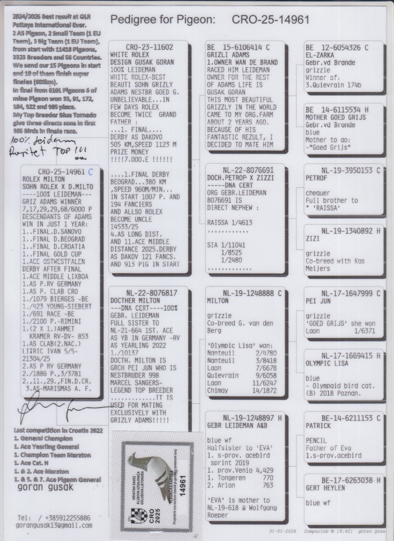 Uit: ”White Rolex”, zoon ”Grizli Adams”, nazaten winnen 1. & 2. OLR Finale As Croatia, 1. OLR Finale Derby Belgrade, 1. OLR Hotspot Fast Rimini, 9. Asduif OLR Golden Algarve x ”Dochter Milton”, dochter ”Milton”