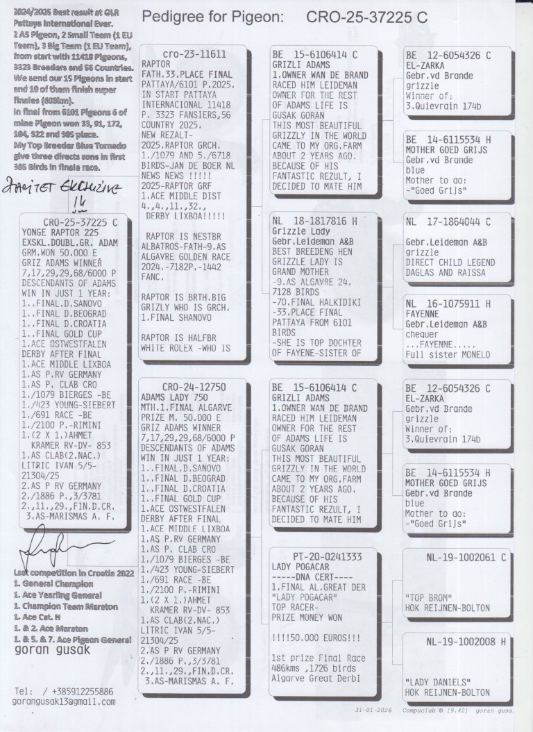 Uit: ”Raptor”, zoon ”Grizli Adams” x ”Adams Lady 750”, dtr. ”Grizli Adams”, nazaten winnen 1. & 2. OLR Finale As Croatia, 1. OLR Finale Derby Belgrade, 1. OLR Hotspot Fast Rimini, 9. Asduif OLR Golden Algarve, nestbroer ”Goed Grijs”
