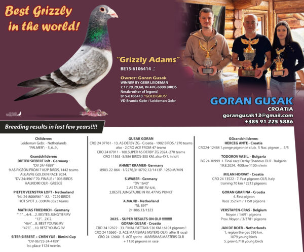 Deze doffer stond lang bekend als “de nestbroer van…”, maar inmiddels heeft hij zijn eigen status ruimschoots verdiend. “Grizli Adams” ontwikkelde zich tot een absolute topvererver die zijn uitzonderlijke klasse doorgeeft aan meerdere generaties. Zijn nakomelingen presteren op niveau en bewijzen keer op keer hun klasse in de zwaarste competities.