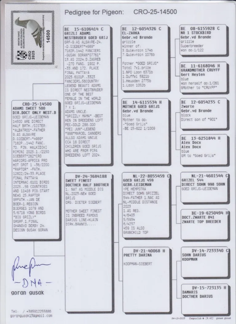 Uit: ”Grizli Adams”, nazaten winnen 1. & 2. OLR Finale As Croatia, 1. OLR Finale Derby Belgrade, 1. OLR Hotspot Fast Rimini, 9. Asduif OLR Golden Algarve, nestbroer ”Goed Grijs” x ”Sweet Finest”, lijn ”New Goed Grijs”, 1. Nat.
