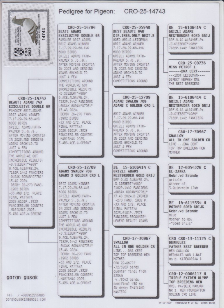 Uit: ”Beati Adams”, uit zoon & dochter ”Grizli Adams”, Super kweker & nestbroer ”Goed Grijs”, 7x 1. Prijs & 1. NPO Laon 6.371 d. x ”Adams Swalow 709”, dochter ”Grizli Adams”, Super kweker & nestbroer ”Goed Grijs”