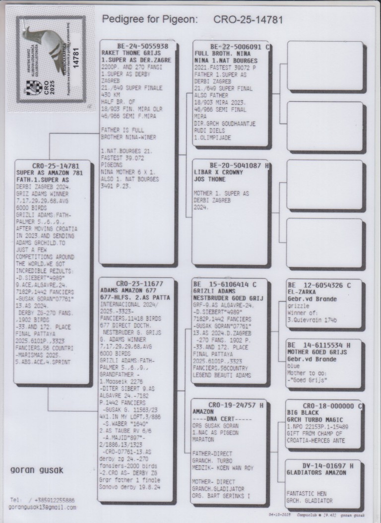 Uit: ”Raket Thoné Grijs”, 1. OLR Super Asduif Derby Zagreb, uit broer ”Nina”, 1. Nat. Bourges 39.072 d. x ”Adams Amazon 677”, dochter ”Grizli Adams”, Superkweker & nestbroer ”Goed Grijs”, 7x 1. Prijs & 1. NPO Laon 6.371 d.