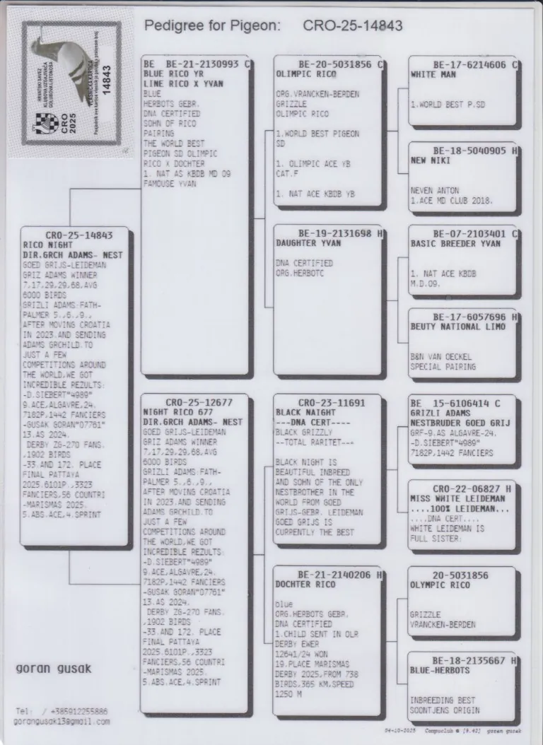 Uit: ”Blue Rico Yr.”, zoon ”Olympic Rico”, 1. Int. Olympiade Cat. Jonge Duiven, 1. Int. Asduif FCI World Best Pigeon x ”Night Rico 67”, uit zoon ”Grizli Adams”, nestbroer ”Goed Grijs”, uit dochter ”Olympic Rico”