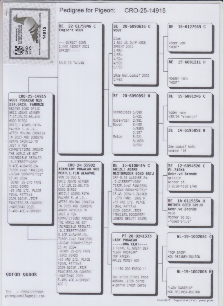 Uit: ”Eagle’s Wout”, zoon ”Wout”, 1. Nat. Asduif Sprint KBDB x ”Adamslady Pogacar”, dochter ”Grizli Adams”, Super kweker & nestbroer ”Goed Grijs”, 7x 1. Prijs & 1. NPO Laon 6.371 d., dochter ”Lady Pogacar”, 1. Final OLR