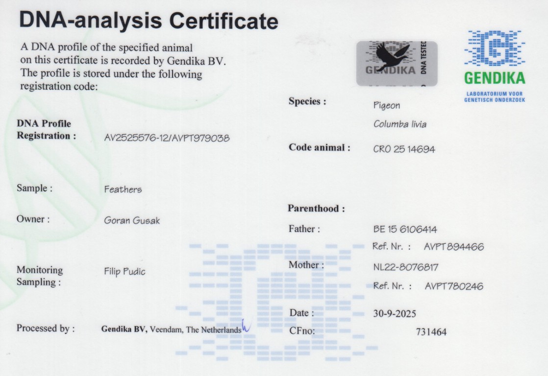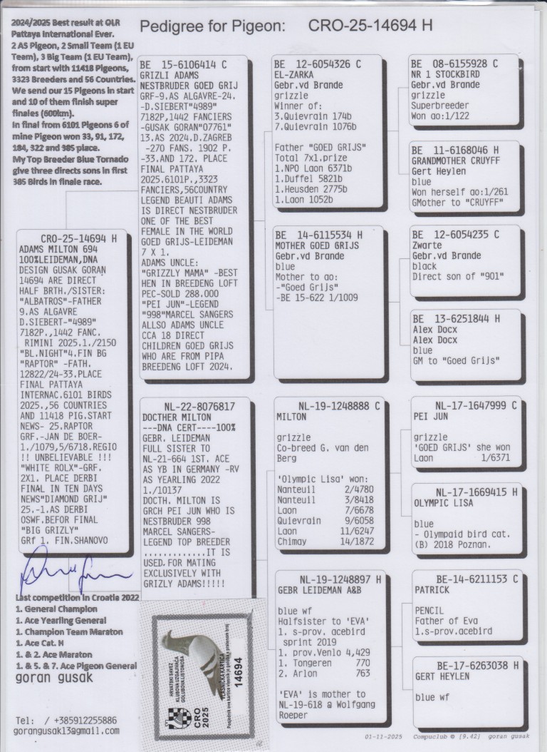 Uit: ”Grizli Adams”, nazaten winnen 1. & 2. OLR Finale As Croatia, 1. OLR Finale Derby Belgrade, 1. OLR Hotspot Fast Rimini, 9. Asduif OLR Golden Algarve, nestbroer ”Goed Grijs” x ”Dochter Milton”, lijn ”Goed Grijs”