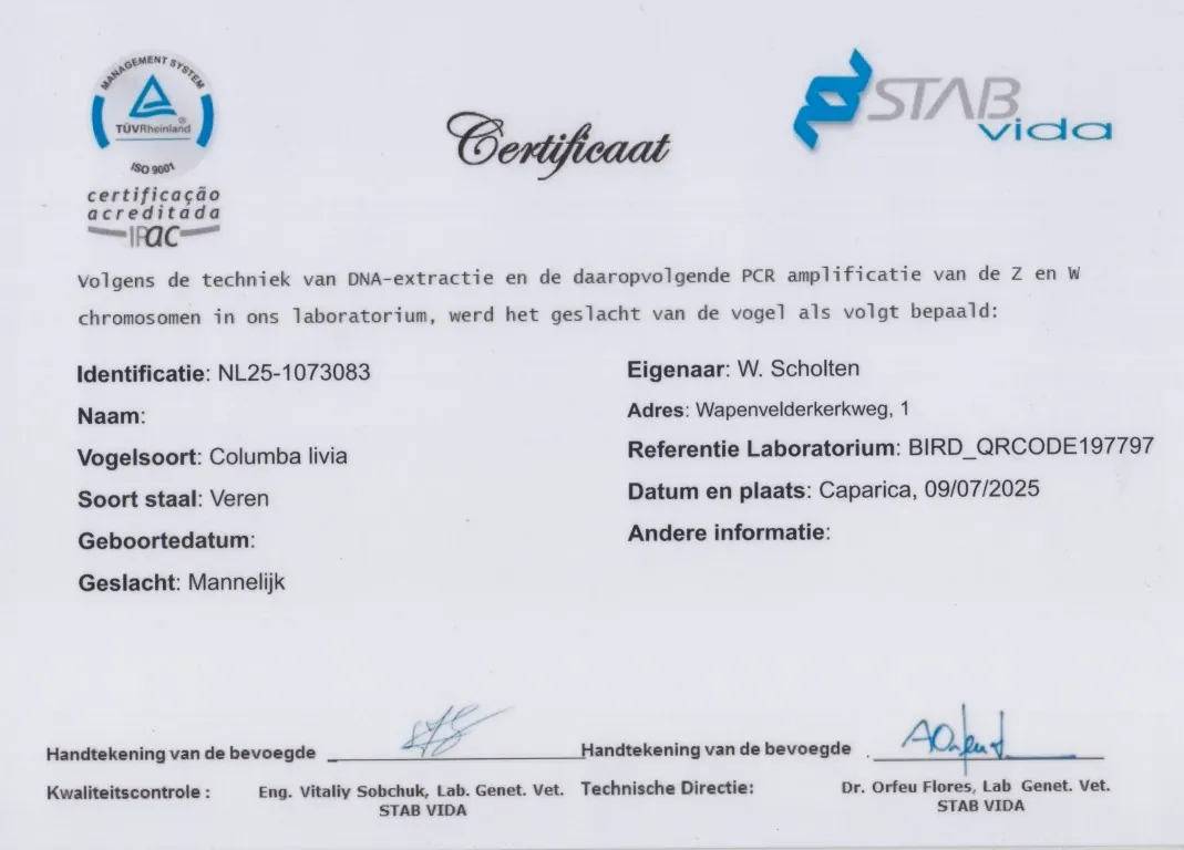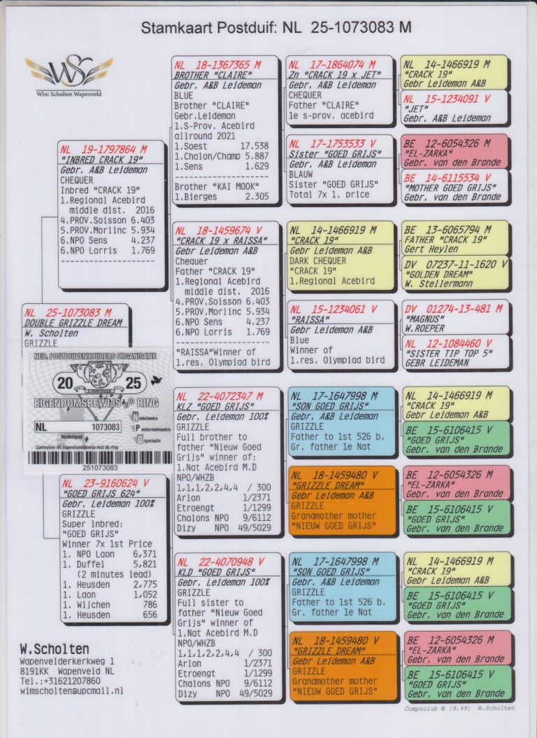 Uit: ”Inbred Crack 19”, uit broer ”Claire”, 1.-17.538 d., 1.-5.887 d., 1.-1.629 d., uit dochter ”Crack 19” & ”Raissa” x ”Goed Grijs 624”, uit zoon & docher ”Son Goed Grijs 998”, gr-vader 1. Nat. Asduif Midfond, inteelt ”Goed Grijs”