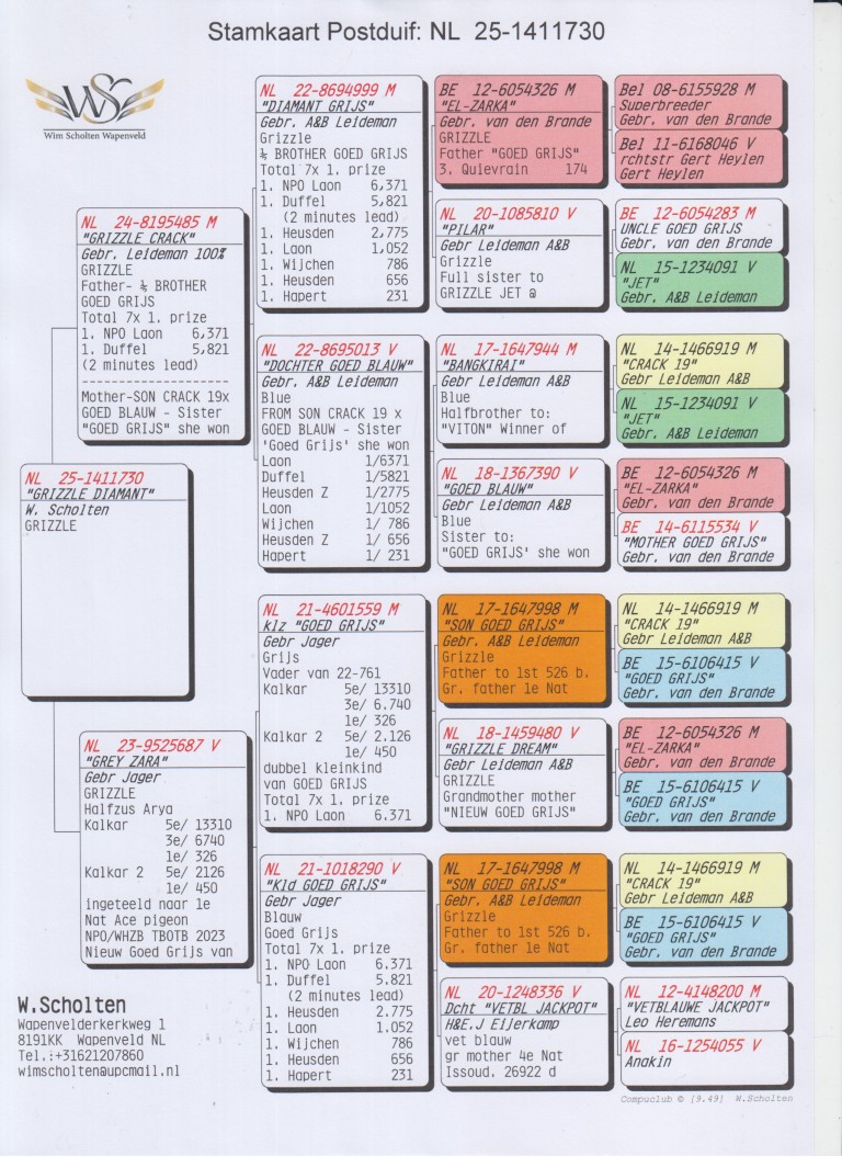 Uit: ”Grizzle Crack”, uit 1/2 broer ”Goed Grijs”, 7x 1. Prijs & 1. NPO Laon 6.371 d., nazaten winnen 7x 1. Nat. Asduif x ”Grey Zara”, uit zoon & dochter ”Son Goed Grijs 998”, gr-vader 1. Nat. Asduif Midfond, inteelt ”Goed Grijs”
