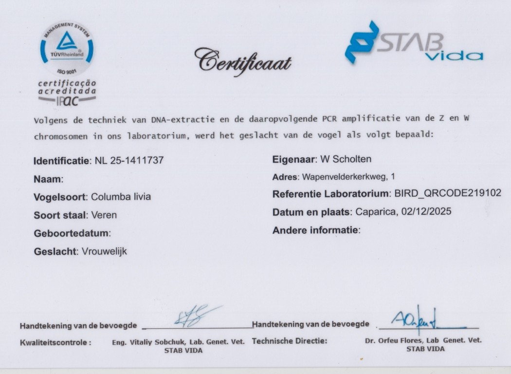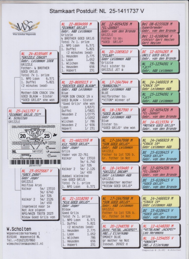 Uit: ”Grizzle Crack”, uit 1/2 broer ”Goed Grijs”, 7x 1. Prijs & 1. NPO Laon 6.371 d., nazaten winnen 7x 1. Nat. Asduif x ”Grey Zara”, uit zoon & dochter ”Son Goed Grijs 998”, gr-vader 1. Nat. Asduif Midfond, inteelt ”Goed Grijs”