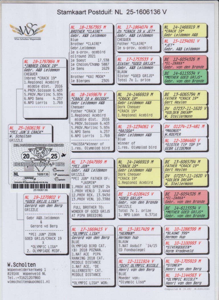Uit: ”Inbred Crack 19”, uit broer ”Claire”, 1.-17.538 d., 1.-5.887 d., 1.-1.629 d., uit dochter ”Crack 19” & ”Raissa” x ”Goed Grijs Lisa”, dochter ”Olympic Lisa”, 2x 1. Nat. Asduif & Olympiade duif, dtr. ”Pei Jun”, zoon ”Goed Grijs”