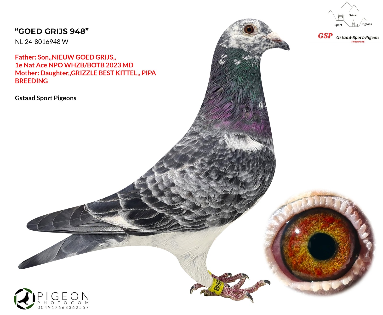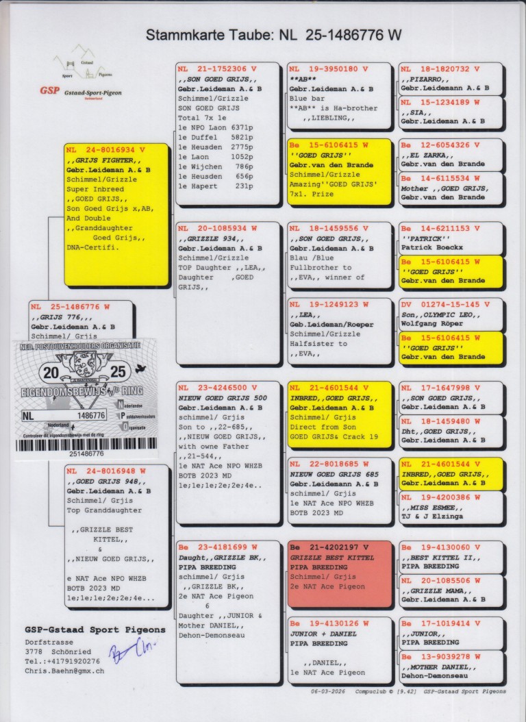 Uit: ”Grijs Fighter”, uit zoon ”Goed Grijs”, 7x 1. prijs & 1. NPO Laon 6.371 d., uit dubbele kld. ”Goed Grijs” x ”Goed Grijs 948”, uit inteelt ”Goed Grijs”, uit dochter ”Grizzle Best Kittel”, 2. Nat. Asduif Sprint