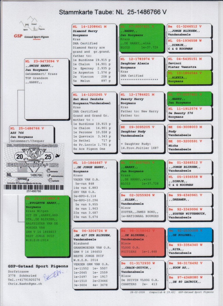 Uit: ”Swiss Harry”, uit zoon ”Harry”, 1. Nat. Asduif Dagfond WHZB, uit dochter ”Beauty Harry”, Superkweker x ”Evolette Harry”, uit dochter ”De Bliksem”, Gaby Vandenabeele, uit zoon ”Harry”, 1. Nat. Asduif Dagfond WHZB