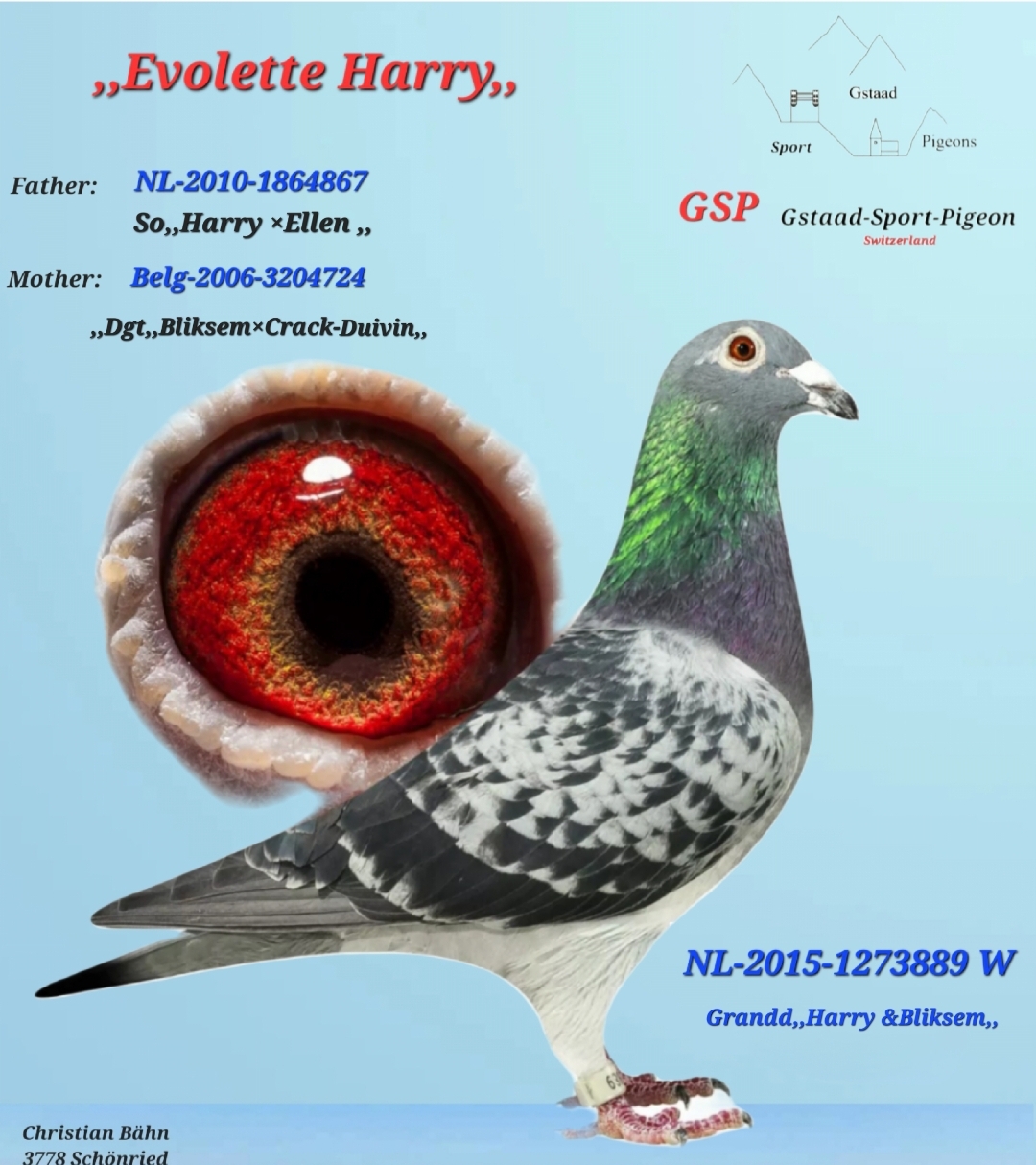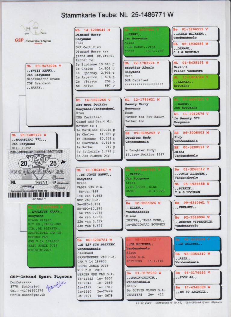Uit: ”Swiss Harry”, uit zoon ”Harry”, 1. Nat. Asduif Dagfond WHZB, uit dochter ”Beauty Harry”, Superkweker x ”Evolette Harry”, uit dochter ”De Bliksem”, Gaby Vandenabeele, uit zoon ”Harry”, 1. Nat. Asduif Dagfond WHZB