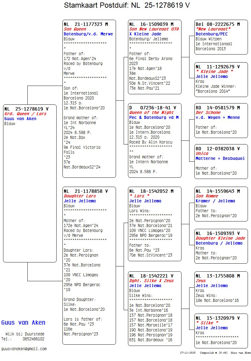 Uit: ”Son Queen”, zoon ”Queen of the Night”, 1. Int. Barcelona 12.315 d., uit zoon ”New Laureaat” & ”Kleine Jade” x ”Daughter Lars”, dochter ”Lars”, 2. Nat. Perpignan, uit dochter ”Silke”, 1. Nat. Barcelona, 2. Int. Narbonne JL