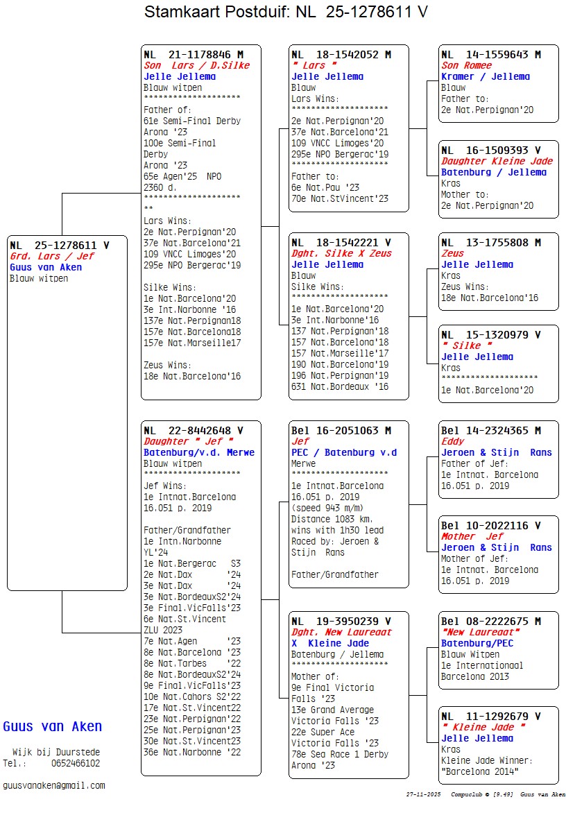 Uit: ”Son Lars / D. Silke”, vader 61. Halve Finale OLR Derby Arona, zoon ”Lars”, 2. Nat. Perpignan, uit dochter ”Silke” x ”Daughter Jef”, 1. Int. Barcelona 16.051 d. (90 min. vooruit), uit dochter ”New Laureaat” & ”Kleine Jade”