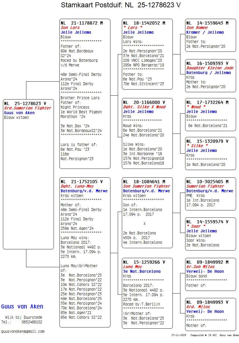 Uit: ”Son Lars”, vader 48. Halve Finale OLR Derby Arona, 80. Nat. Bordeaux, broer ”Prince Lars”, vader 1. Nat. Asduif FCI Marathon, zoon ”Lars”, 2. Nat. Perpignan x ”Dtr. Luna-May”, dochter ”Luna-May”, 5. Int. Barcelona