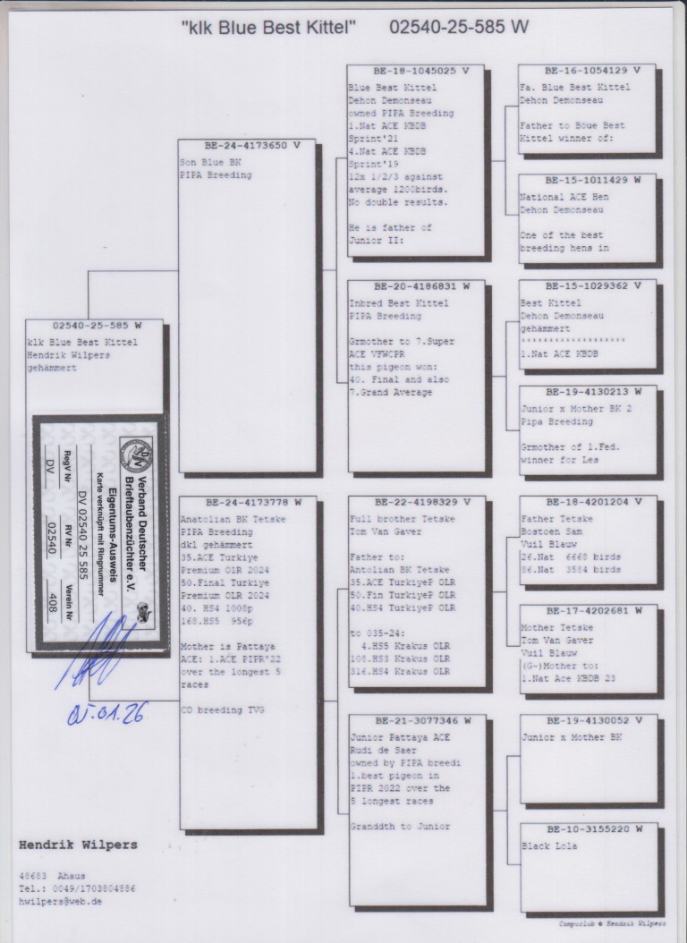 Uit: ”Son Blue Best Kittel”, zoon ”Blue Best Kittel”, 1. & 4. Nat. Asduif Sprint KBDB, uit dochter ”Best Kittel”, 1. & 4. Nat. Asduif Sprint KBDB x ”Anatolian BK Tetske”, 35. Asduif OLR Turkiye & 50. Finale, uit broer ”Tetske”