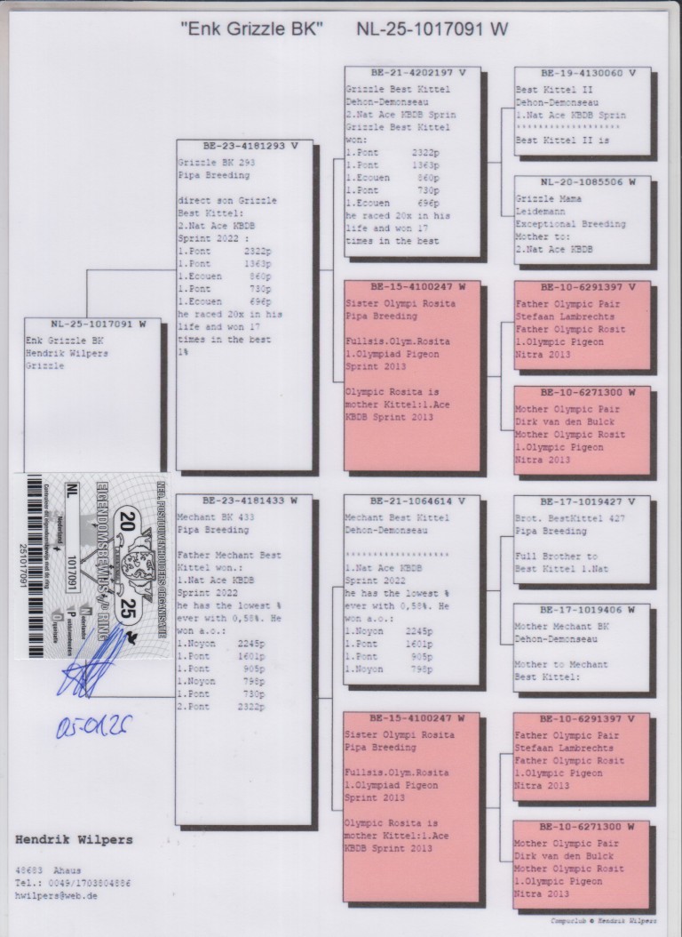 Uit: ”Grizzle BK293”, zoon ”Grizzle Best Kittel”, 2. Nat. Asduif Sprint KBDB (Achter hokgenoot) x ”Méchant BK 433”, dochter ”Méchant Best Kittel”, 1. Nat. Asduif Sprint KBDB & gr-vader 1. Extra Finale PIPR Pattaya 2026
