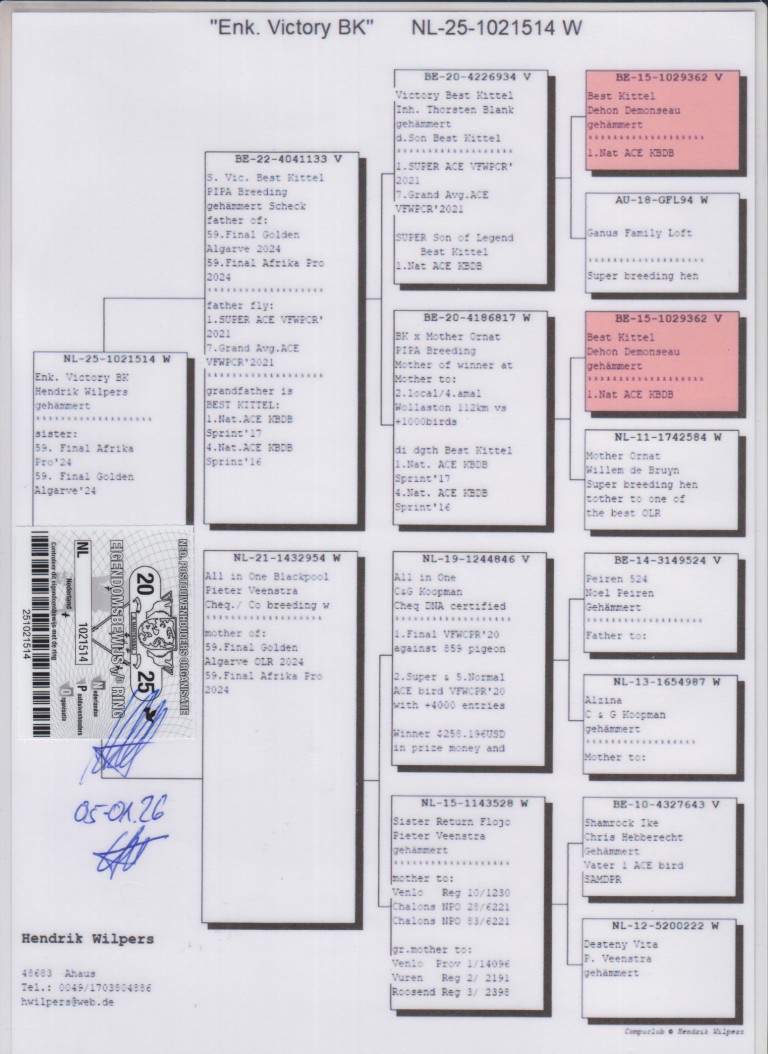 ”Enk. Victory BK”, zus 59. Finale OLR Algarve, 59. Finale OLR Afrika, uit: ”Son Victory Best Kittel”, zoon ”Victory Best Kittel”, 1. Super Ace Victoria Falls x ”All in One Blackpool”, dochter ”All in One”, 1. Finale OLR Victoria Fallss