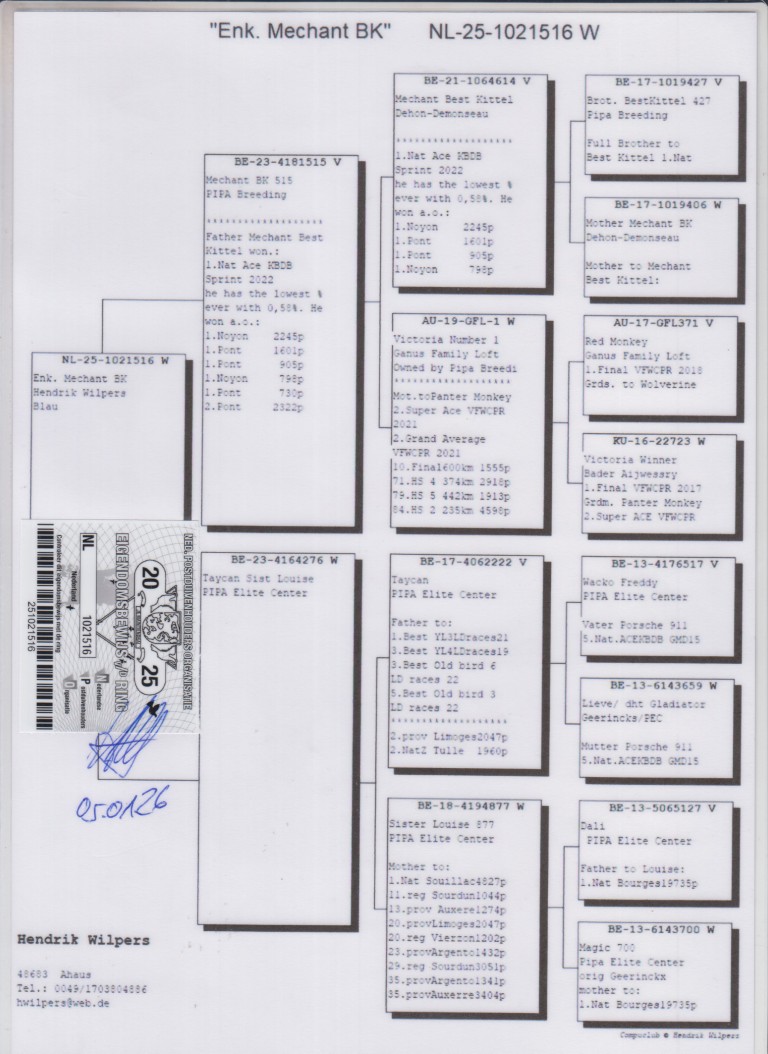 Uit: ”Méchant BK 515”, 1/2 broer ”Panter Monkey”, 2. Super Asduif & 2. Grand Average Victoria Falls, zoon ”Méchant Best Kittel”, 1. Nat. Asduif Sprint KBDB x ”Taycan Sist. Louise”, 1/2 zus 1. Nat. KBDB & 1.-3.-3.-5. Nat. Asduif