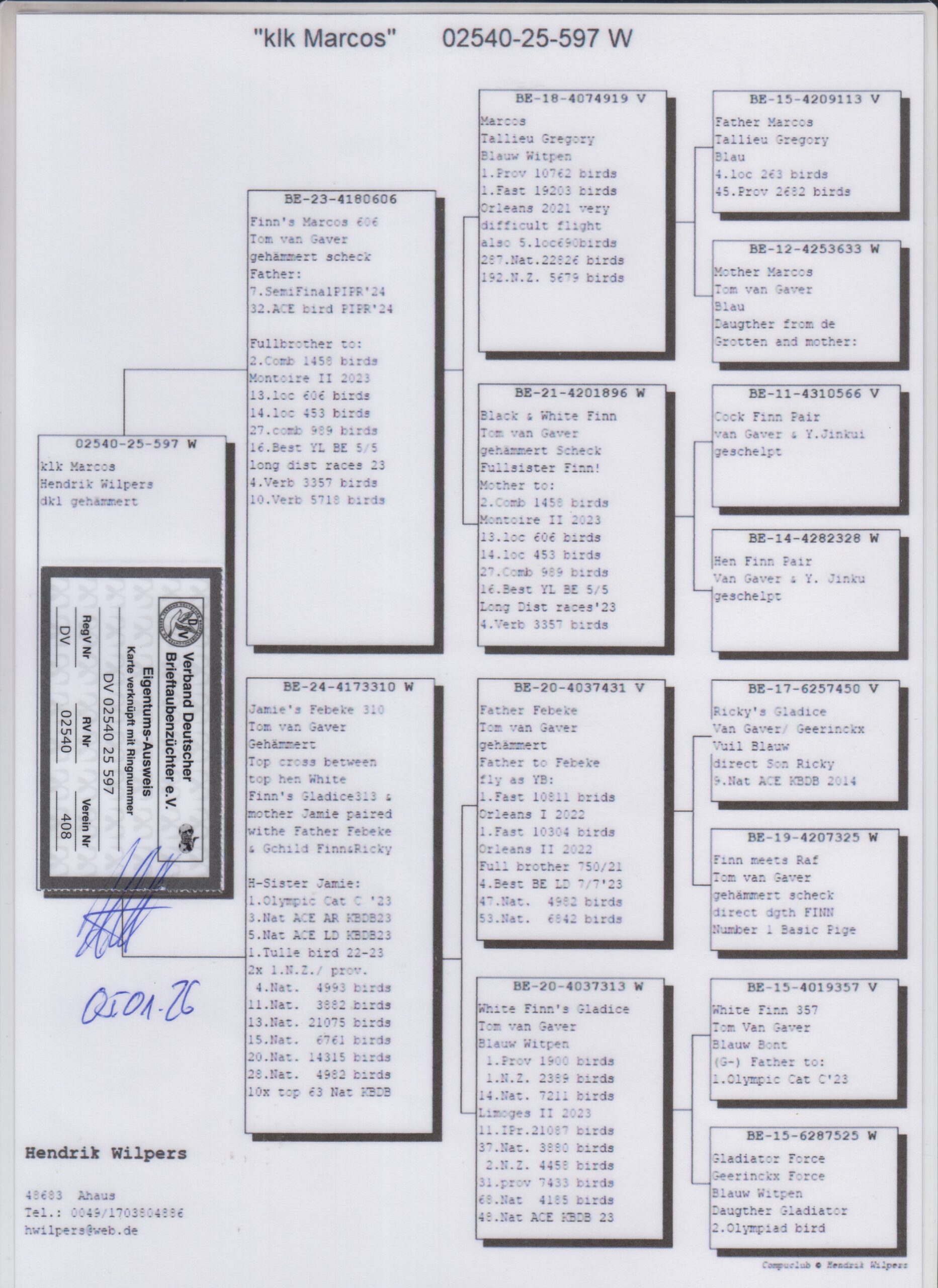 Uit: ”Finn’s Marcos 606”, vader 7. Halve Finale OLR PIPR Pattaya 2024, 32. Asduif OLR PIPR Pattaya 2024, uit zus ”Finn” x ”Jamie’s Febeke 310”, 1/2 zus ”Jamie”, 1. Olympiade duif Cat. Fond, 3. & 5. Nat. Asduif KBDB