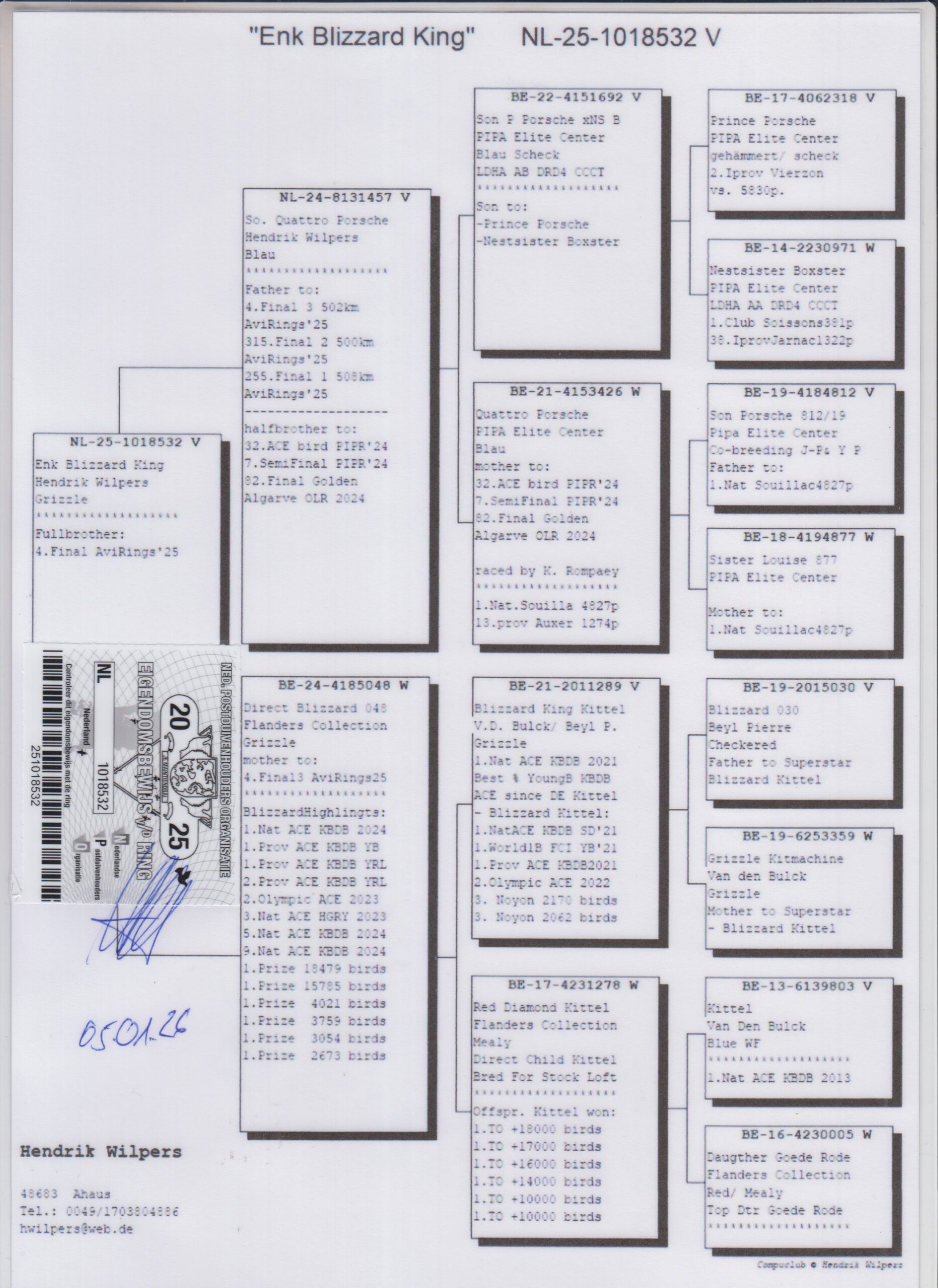 Uit: ”Son Quattro Porsche”, vader 4. Finale OLR Avrings 2025, uit zoon ”Prince Porsche”, OLR Wonderkweker x ”Direct Blizzard”, moeder 4. Finale OLR Avrings 2025, dtr. ”Blizzard King Kittel”, 1. Nat. Asduif Sprint KBDB