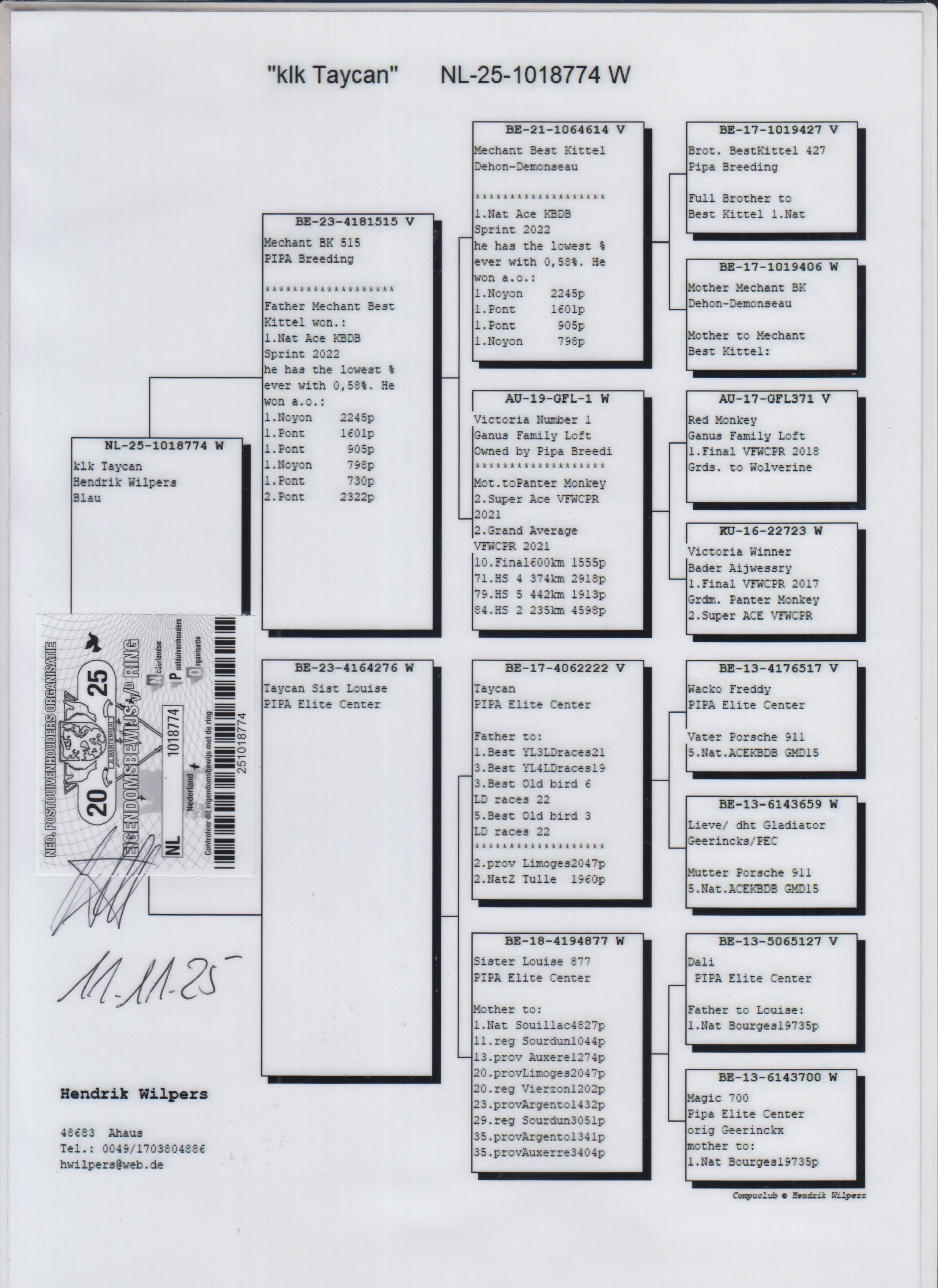 Uit: ”Méchant BK 515”, 1/2 broer ”Panter Monkey”, 2. Super Asduif & 2. Grand Average Victoria Falls, zoon ”Méchant Best Kittel”, 1. Nat. Asduif Sprint KBDB x ”Taycan Sist. Louise”, 1/2 zus 1. Nat. KBDB & 1.-3.-3.-5. Nat. Asduif