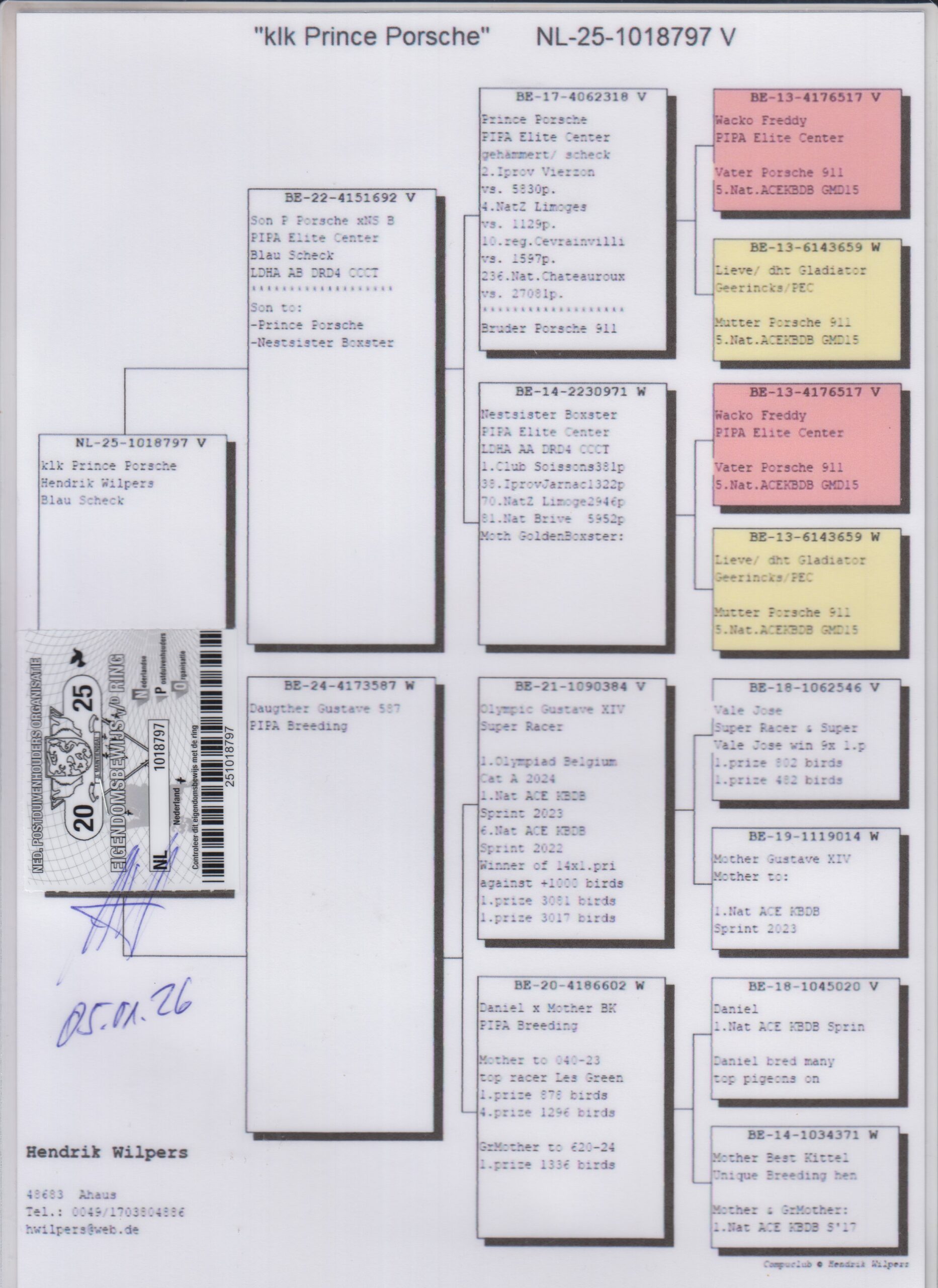 Uit: ”Son P. Porsche x NS B.”, zoon ”Prince Porsche”, OLR Wonderkweker x ”Daughter Gustave XIV”, dochter ”Olympic Gustave XIV”, 1. Olympiade duif, 1. & 6. Nat. Asduif Sprint KBDB, uit dochter ”Daniël”, 1. Nat. Asduif KBDB