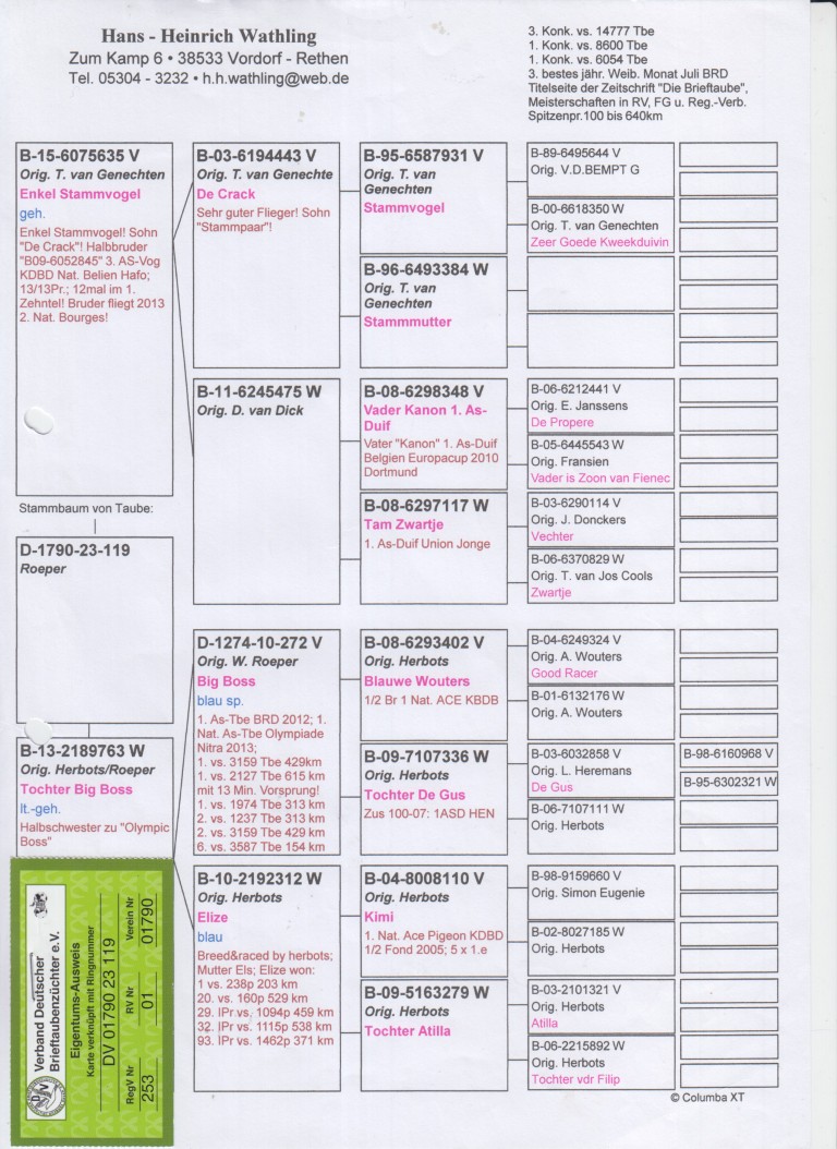 Uit: ”Enkel Stamvogel”, uit 1/2 zus ”Kanon”, 1. Europese Asduif x ”Tochter Big Boss”, dochter ”Big Boss”, 1. Nat. Asduif Duitsland, 1. Olympiade duif, 1.-3.159 d., 1.-2.127 d., 1.-1.974 d., 2.-1.237 d., 2.-3.159 d., 6.-3.587 d.