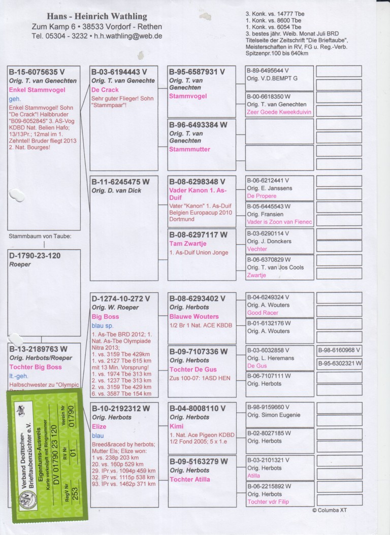 Uit: ”Enkel Stamvogel”, uit 1/2 zus ”Kanon”, 1. Europese Asduif x ”Tochter Big Boss”, dochter ”Big Boss”, 1. Nat. Asduif Duitsland, 1. Olympiade duif, 1.-3.159 d., 1.-2.127 d., 1.-1.974 d., 2.-1.237 d., 2.-3.159 d., 6.-3.587 d.
