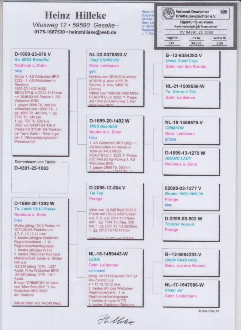 Uit: ”So. Miss Beautiful”, zoon ”Miss Beautiful”, 1. Nat. Asduivin Duitsland, 1.-10.607 d., 1.-4.665 d., 1.-2.720 d., 1.-755 d. x ”To. Leide 13/13 Preise”, dochter ”Leide”, 1. Regionaal Asduif & uit ”Oom Goed Grijs”, Superkweker