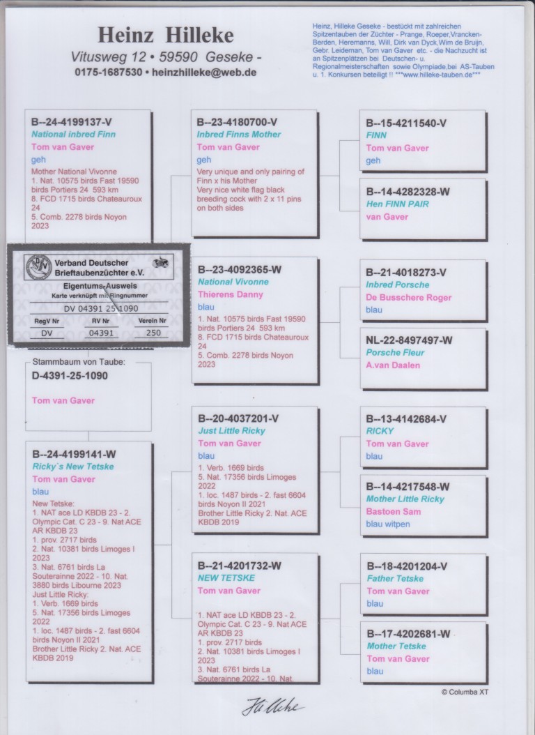Uit: ”National Inbred Finn”, zoon ”National Vivonne”, 1. Nat. Poitiers 19.590 d., uit zoon Stamvader ”Finn” x ”Ricky’s New Tetske”, dochter ”New Tetske”, 1. Nat. Asduif Fond KBDB, 2. Olympiade duif Fond, uit zoon ”Ricky”