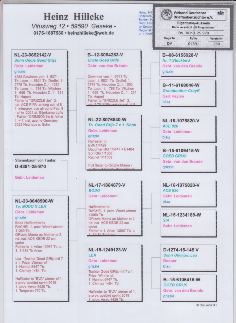 Uit: ”Sohn Uncle Goed Grijs”, zoon ”Oom Goed Grijs”, vader ”Grizzle Jet”, 2. Nat. Asduif, gr-vader 1. & 7. Nat. Asduif Duitsland, uit dochter ”Ace 820” & ”Goed Grijs” x ”To. Bodo x Lea”, uit dochter ”Goed Grijs”, 7x 1. Prijs