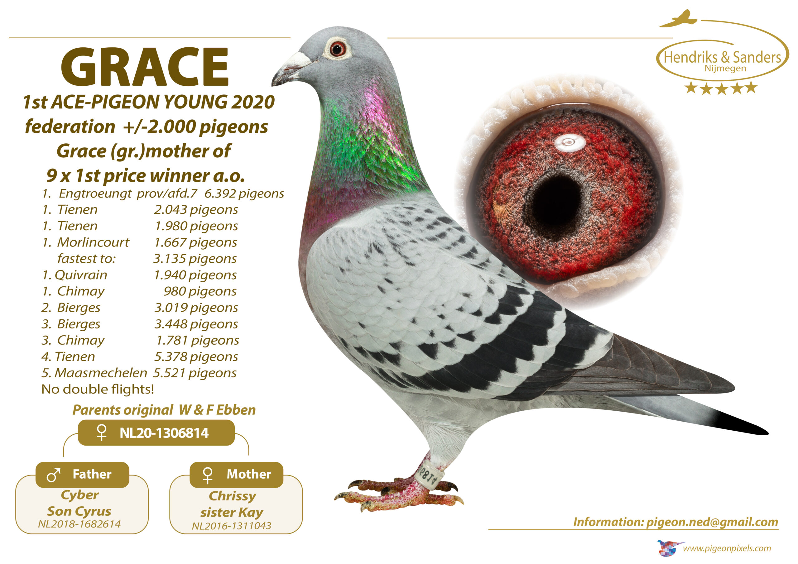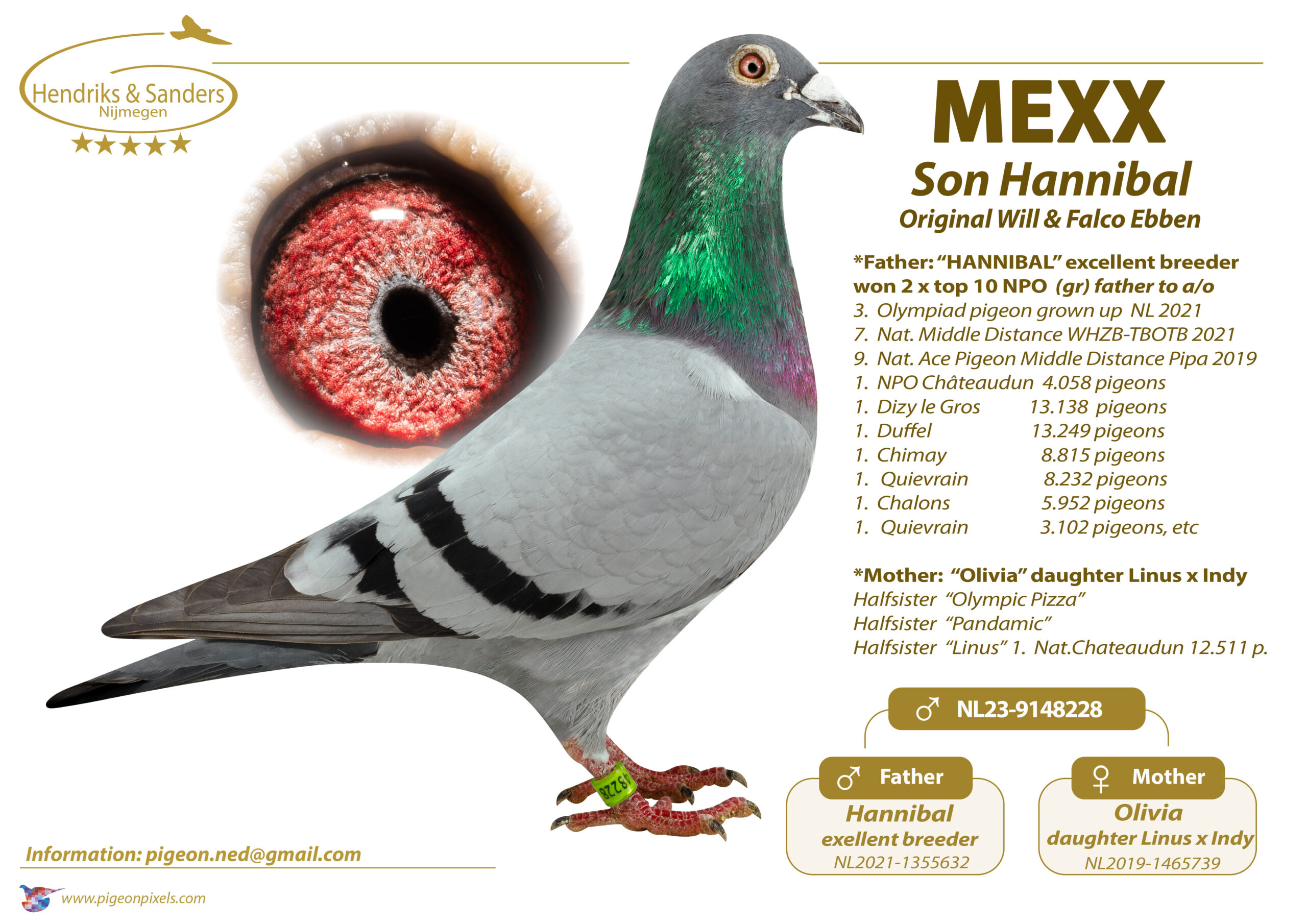 Uit: ”Mexx”, zoon ”Hannibal”, 7. NPO 2.335 d., 9. NPO 6.668 d., uit dochter ”Linus” & ”Indy” x ”Grace”, 1. Asduif Federatie Jonge Duiven, moeder & gr-moeder 1. Prov. 6.392 d., 1.-3.014 d., 1.-2.043 d., 1-.1.980 d., 1.-1.667 d.