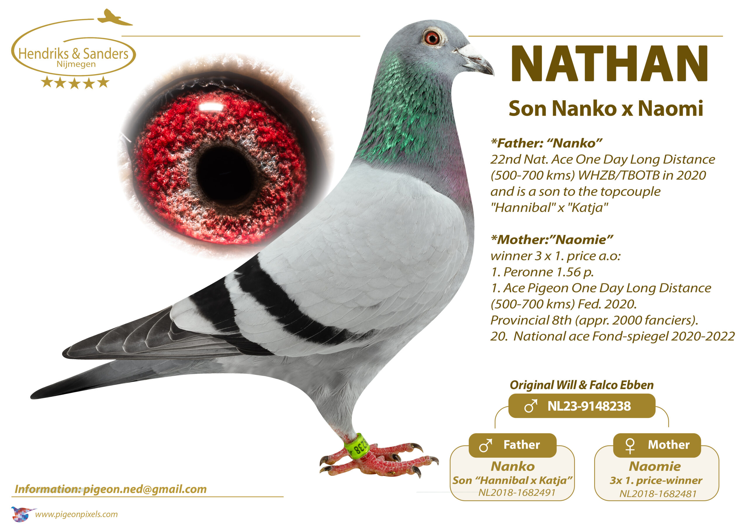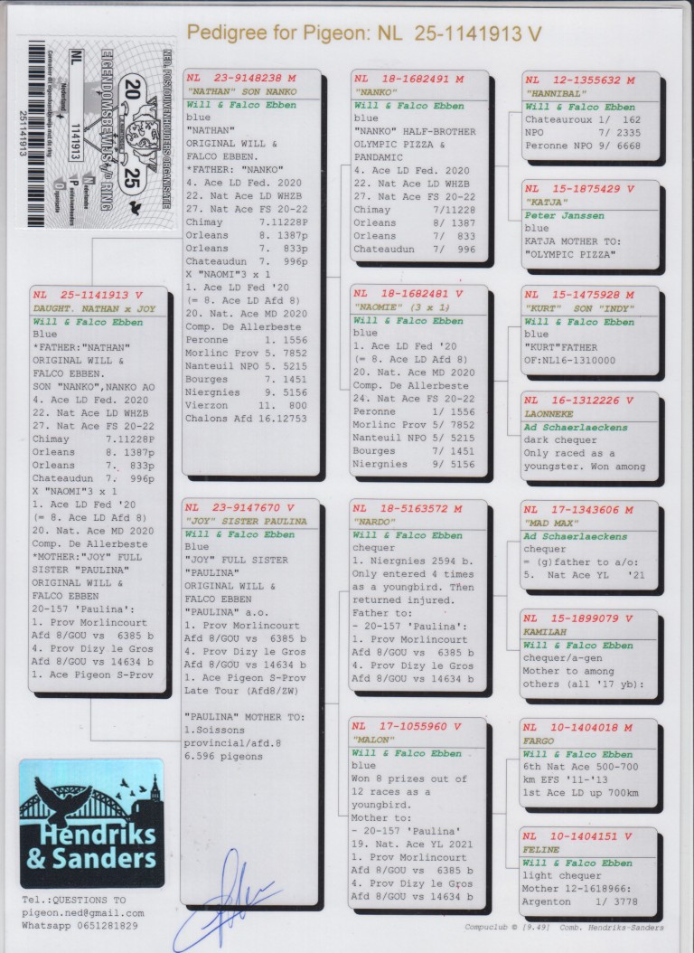 Uit: ”Nathan”, zoon ”Nanko”, 4. Asduif Federatie, 22. Nat. Asduif WHZB, zoon ”Naomie”, 1. Asduif Federatie, 20. Nat. Asduif x ”Joy”, zus ”Paulina”, 1. Prov. Morlincourt 6.385 d., 1. Semi-Prov. Asduif, moeder 1. Prov. 6.596 d.