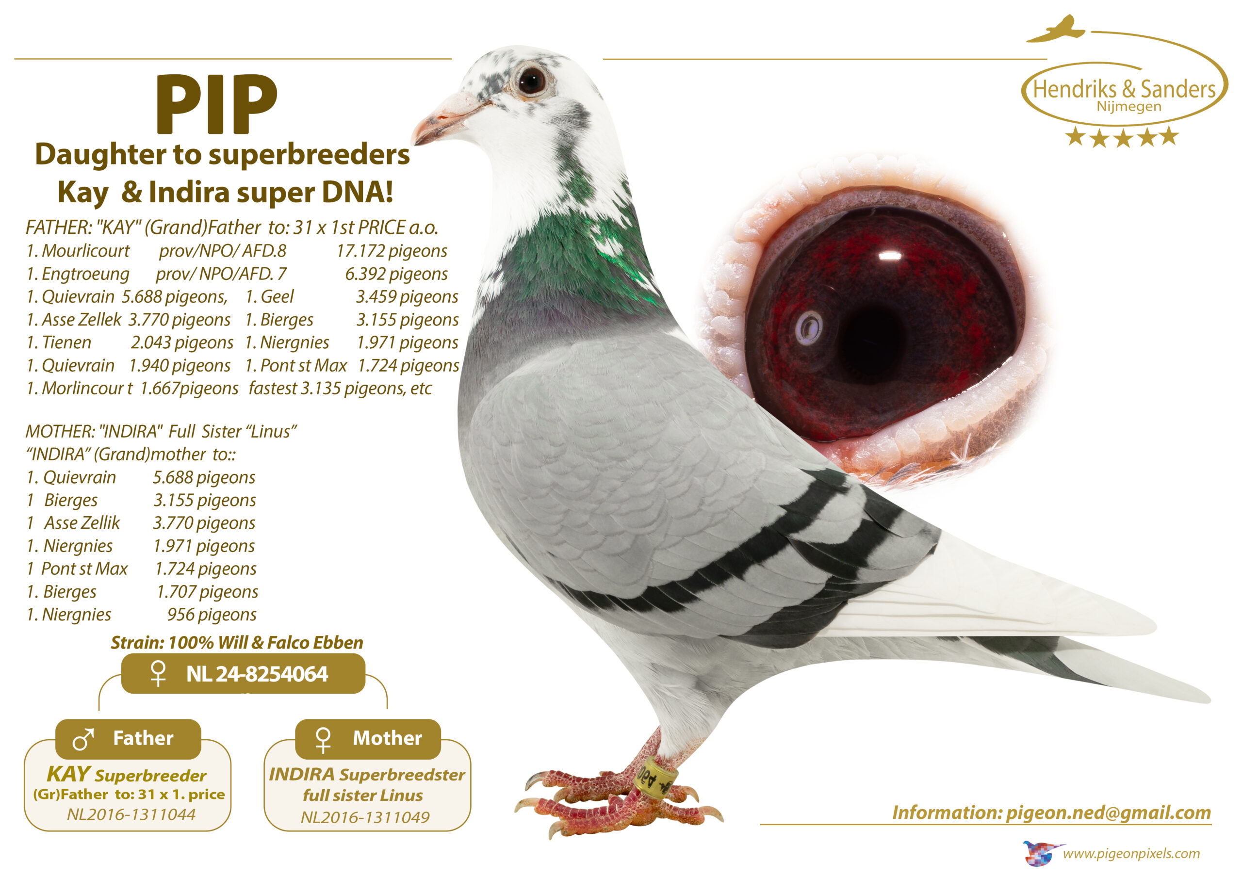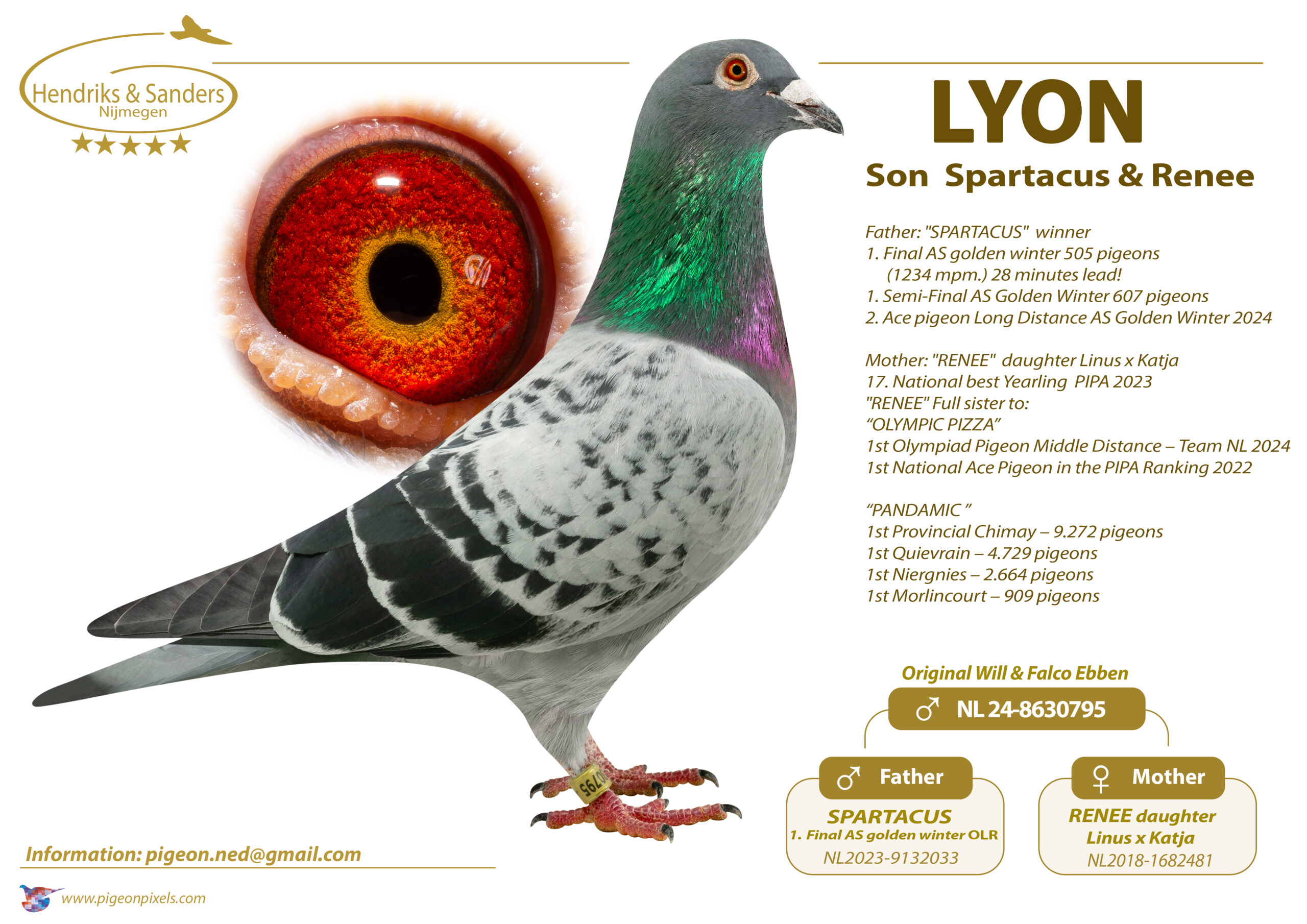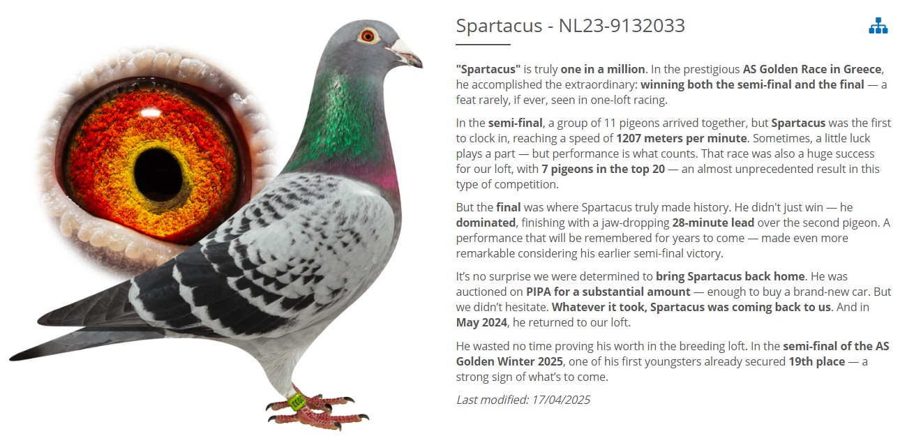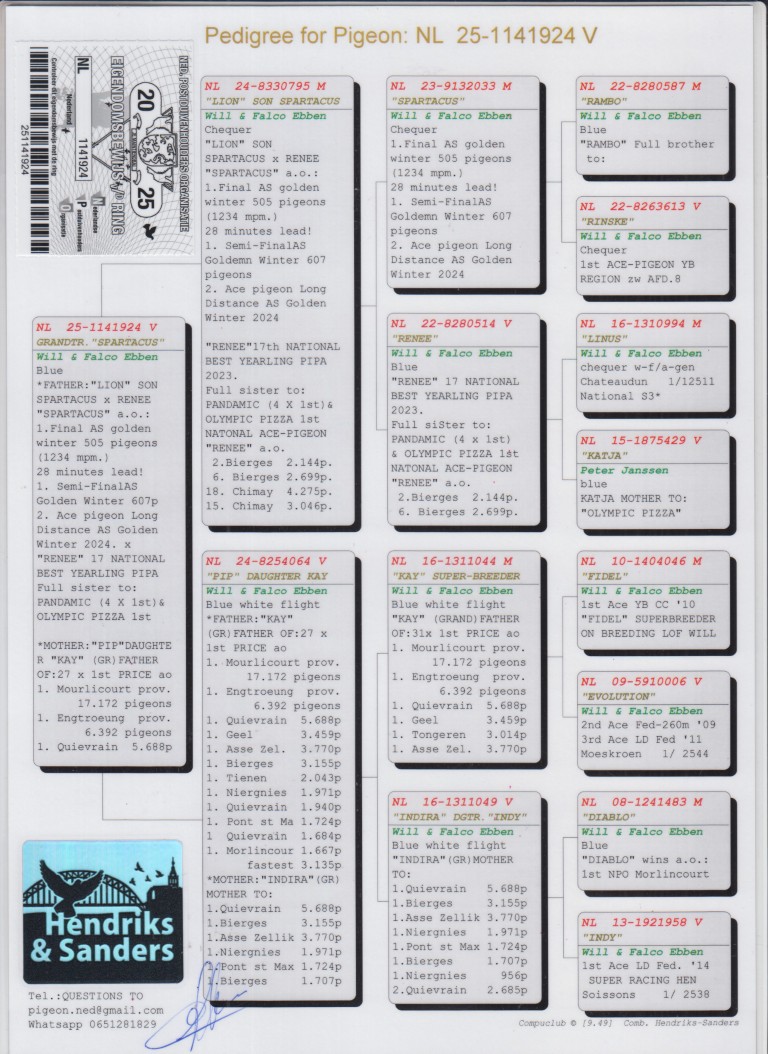 Uit: ”Lion”, zoon ”Spartacus”, 1. Finale OLR Golden As Winter Race (28 min. vooruit), 1. Halve Finale OLR Golden As Winter Race x ”Pip”, dochter ”Kay”, vader & gr-vader 1.-17.172 d., 1.-6.392 d., dochter ”Indira”, Superkweker