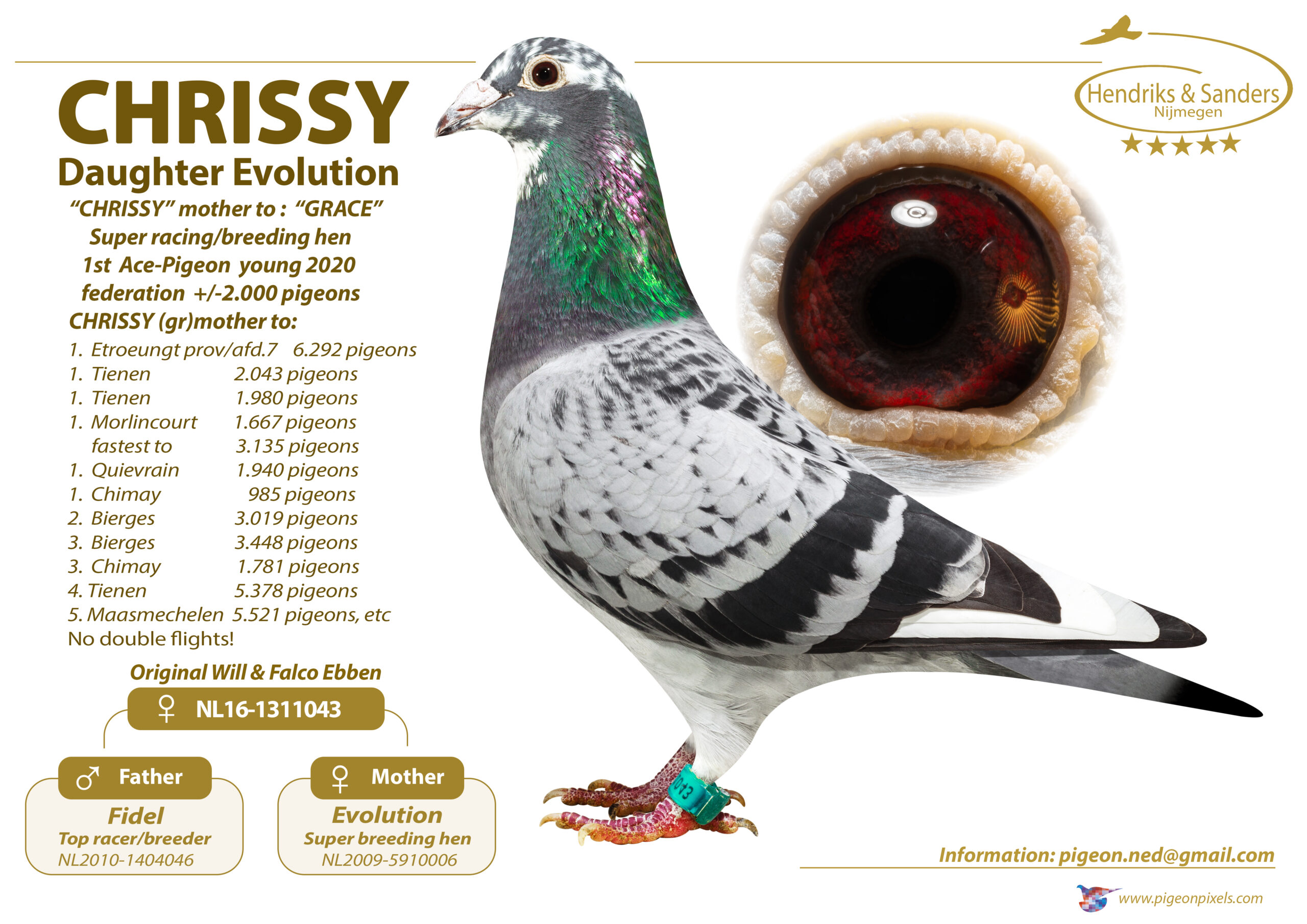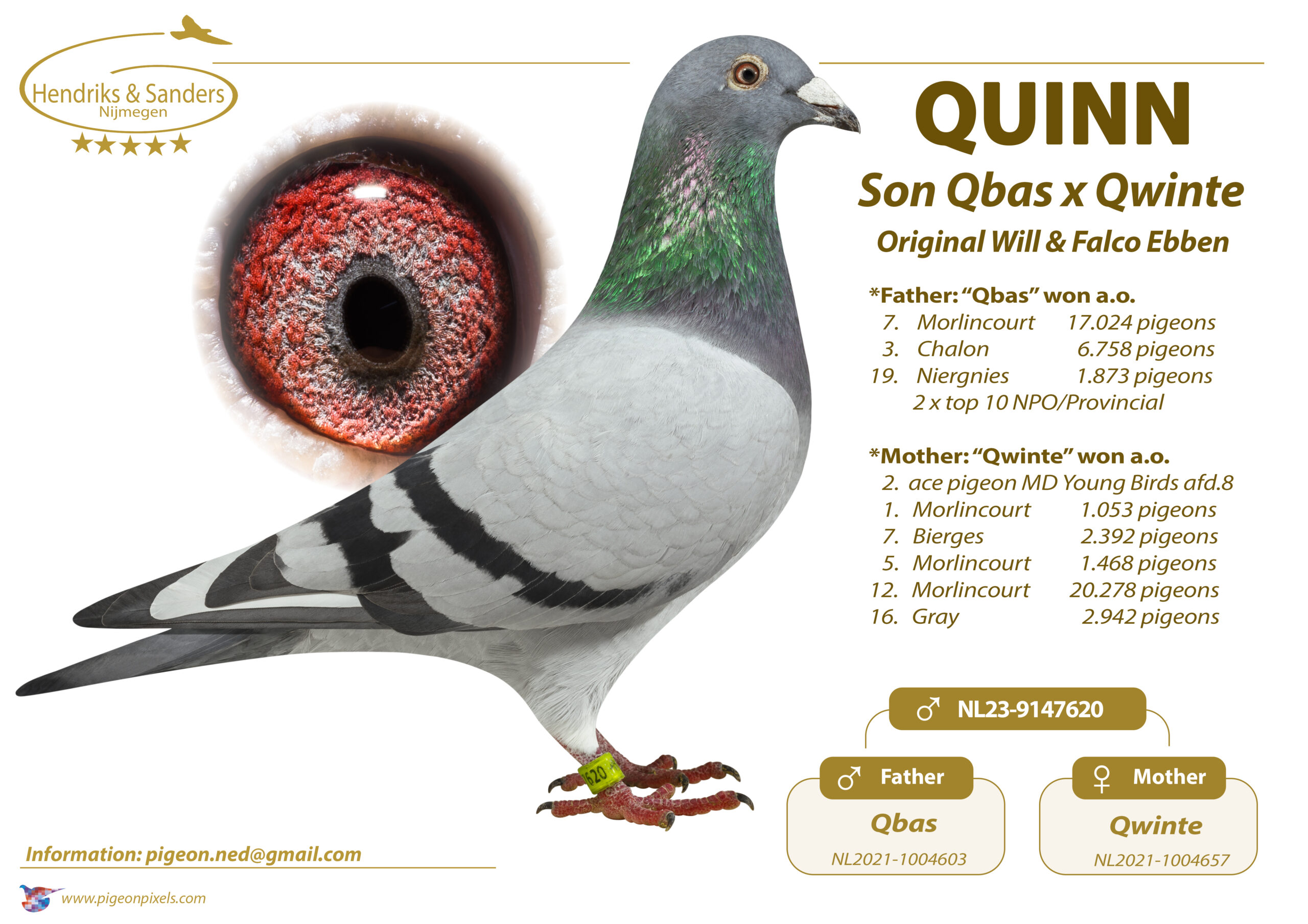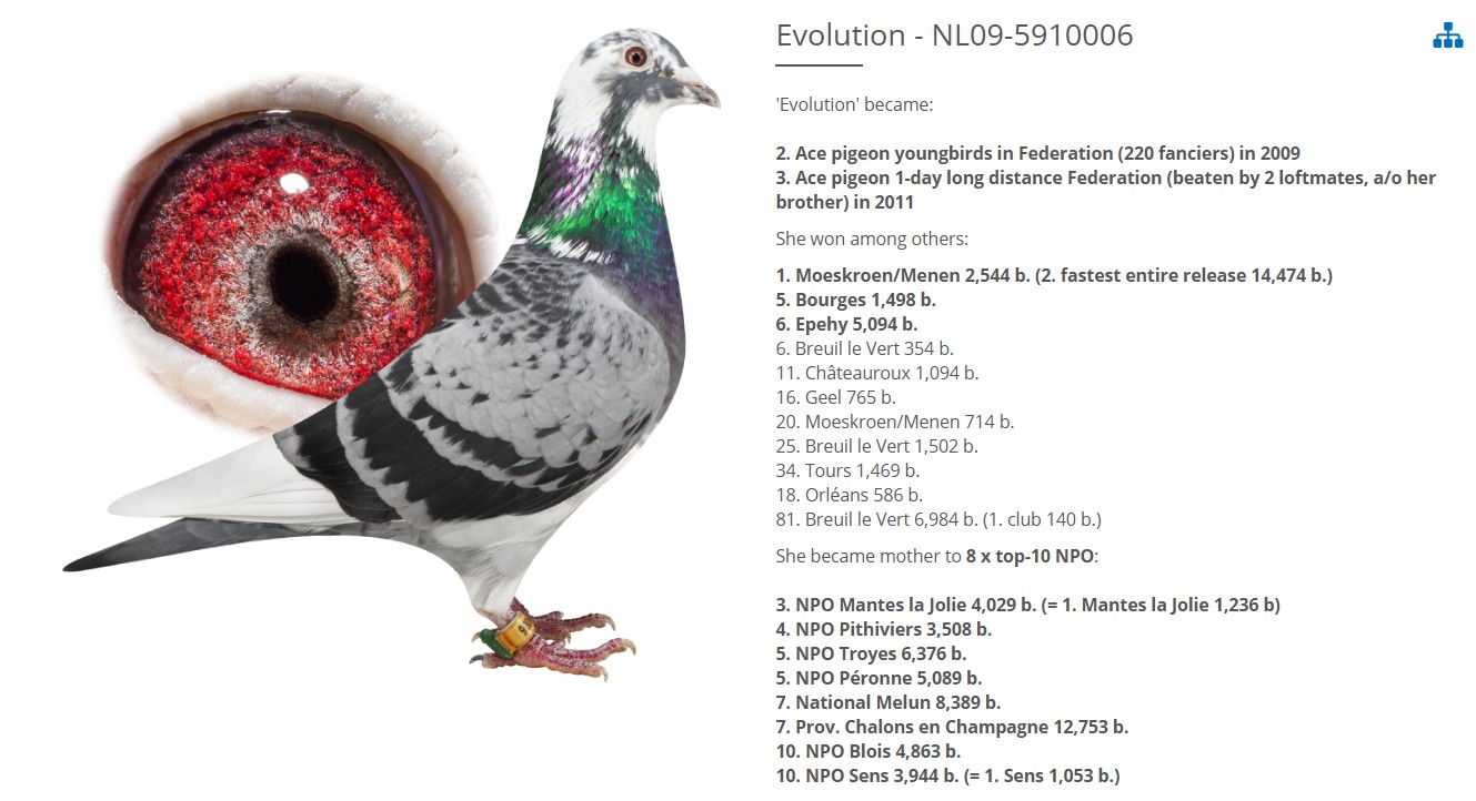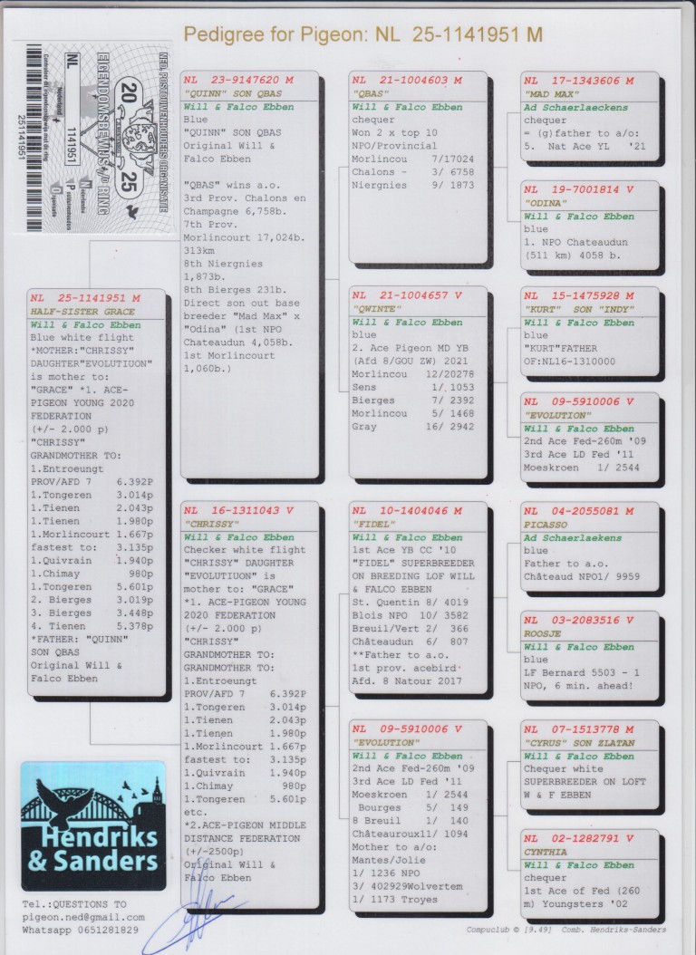Uit: ”Quinn”, zoon ”Qbas”, 3.-6.758d., 7.-17.024d., uit ”Mad Max” & ”Qwinte”, 12.-20.278d. x ”Chrissy”, moeder ”Grace”, 1. Asduif Federatie Jonge Duiven, dochter ”Fidel”, top kweker & ”Evolution”, 3. Prov. Aduif