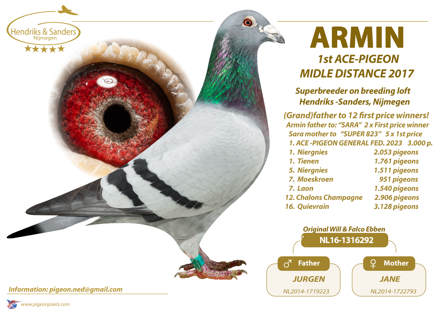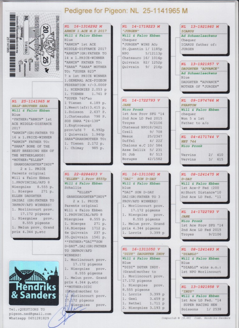 Uit: ”Armin”, 1. Asduif Midfond, vader & gr-vader 14x 1. Prijs, 1. Asduif Federatie Generaal, 1. Prov. 6.392 d., 1.-4.189 d., 1.-2.053 d., 1.-1.761 d. x ”Ellen”, 1. Prov. 8.555 d., 1.-271 d., 6.-237 d., 14.-1.712 d., uit dochter ”Diablo” & ”Indy”