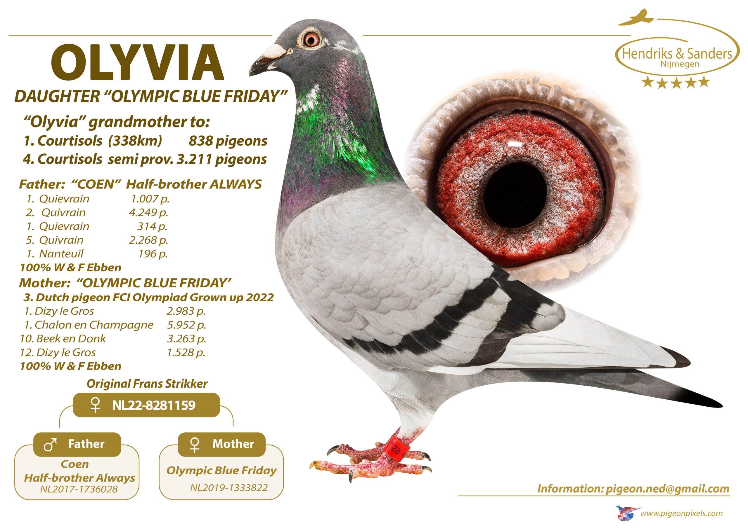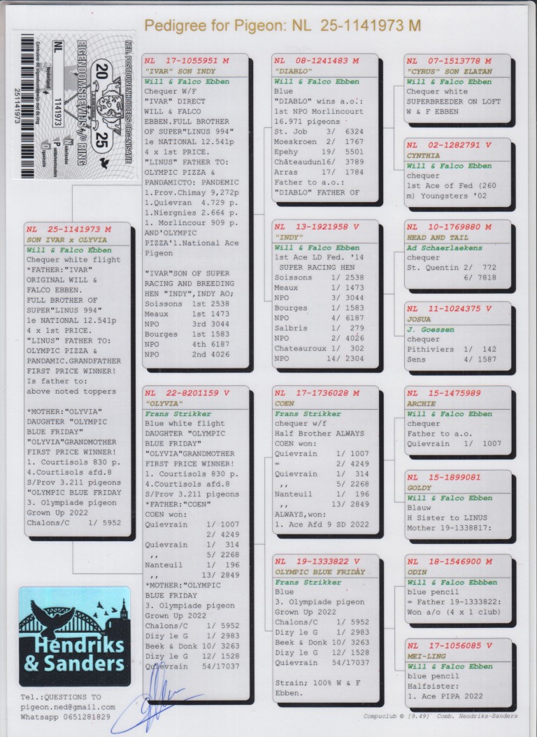 Uit: ”Ivar”, broer ”Linus”, 1. Nat. Chateaudun 12.541 d., stamvader Ebben & vader ”Olympic Pizza” & ”Pandemic” x ”Olyvia”, dochter ”Olympic Blue Friday”, 3. Olympiade duif Cat. Grown Up, dochter ”Coen”, 1.-1.007 d., 1.-314 d.